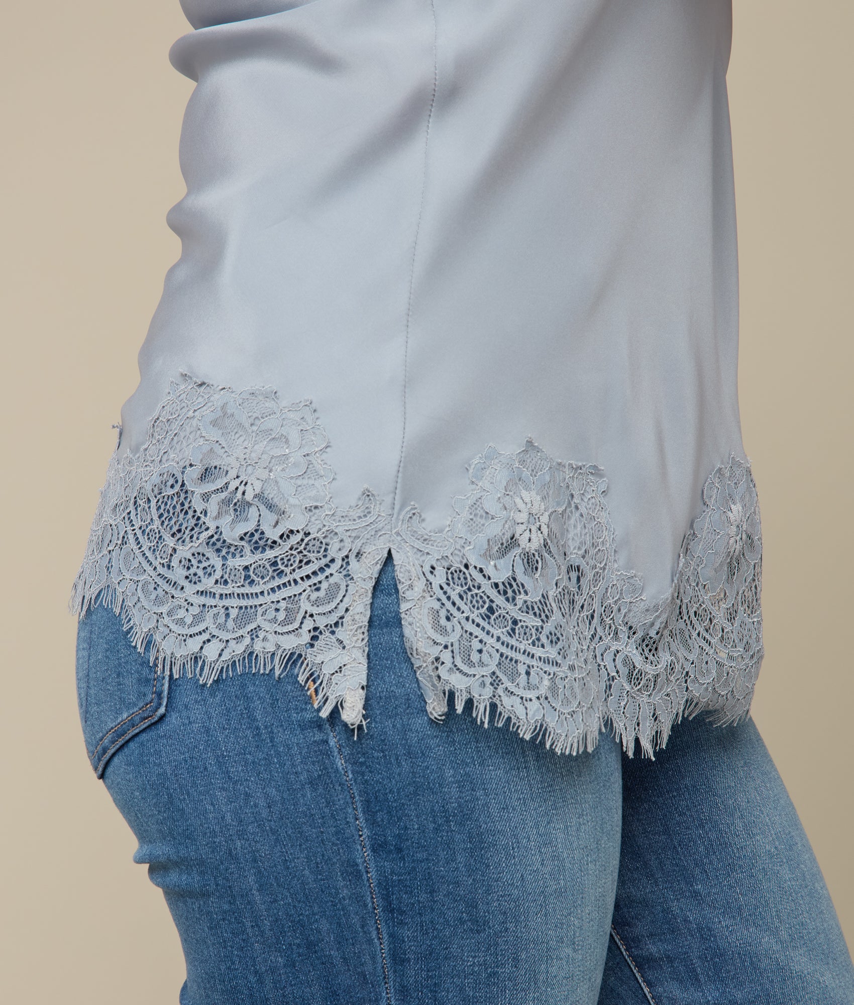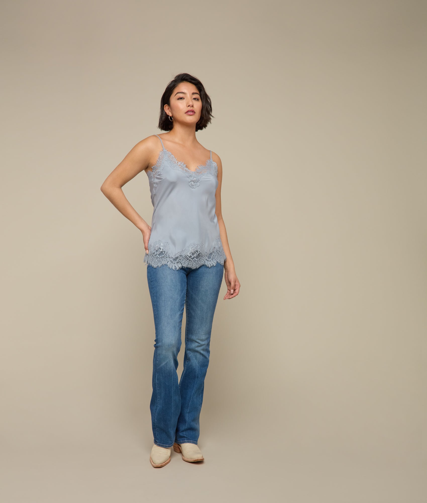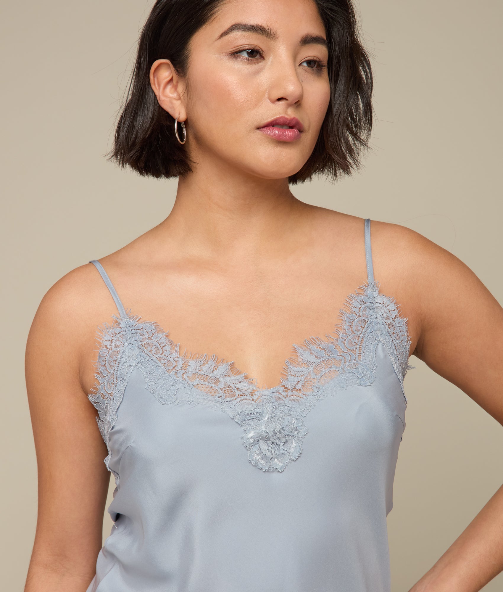 Crafted from luxurious silk. the Amelia Coco Bias Cami features a subtle sheen and a flattering fit. A refined floral design and delicate lace detailing offer a look of elegance. Perfect for transitioning from daytime chic to evening allure.