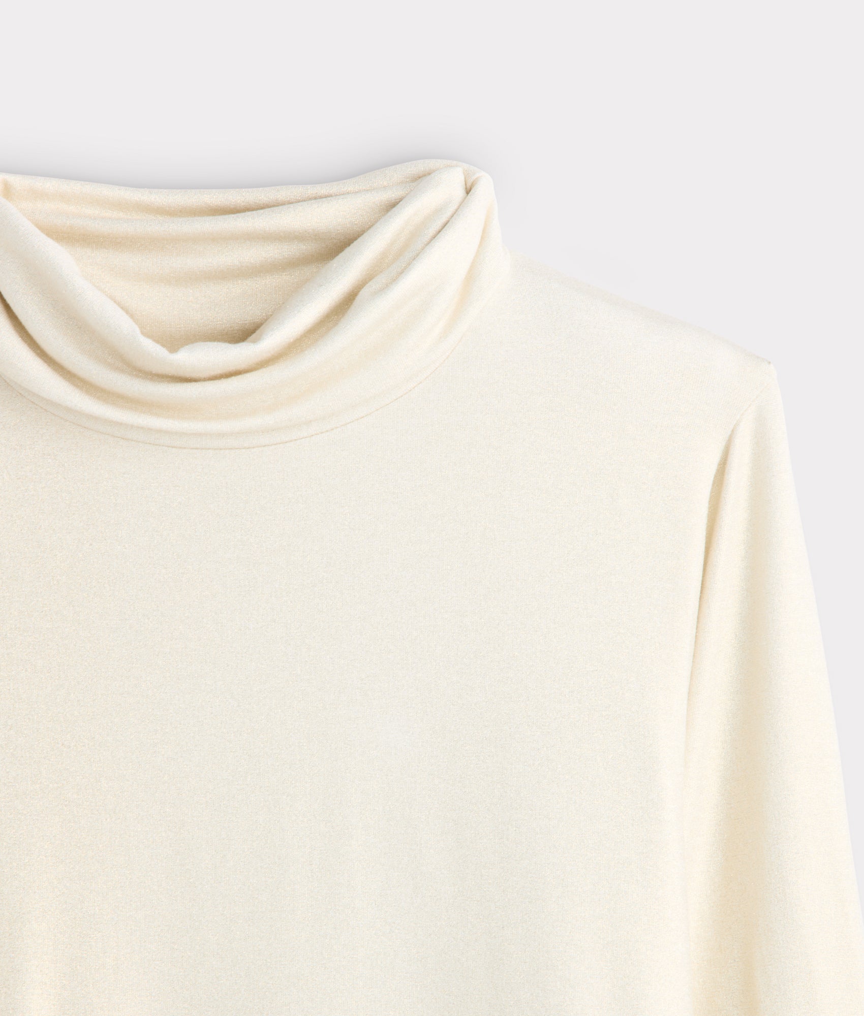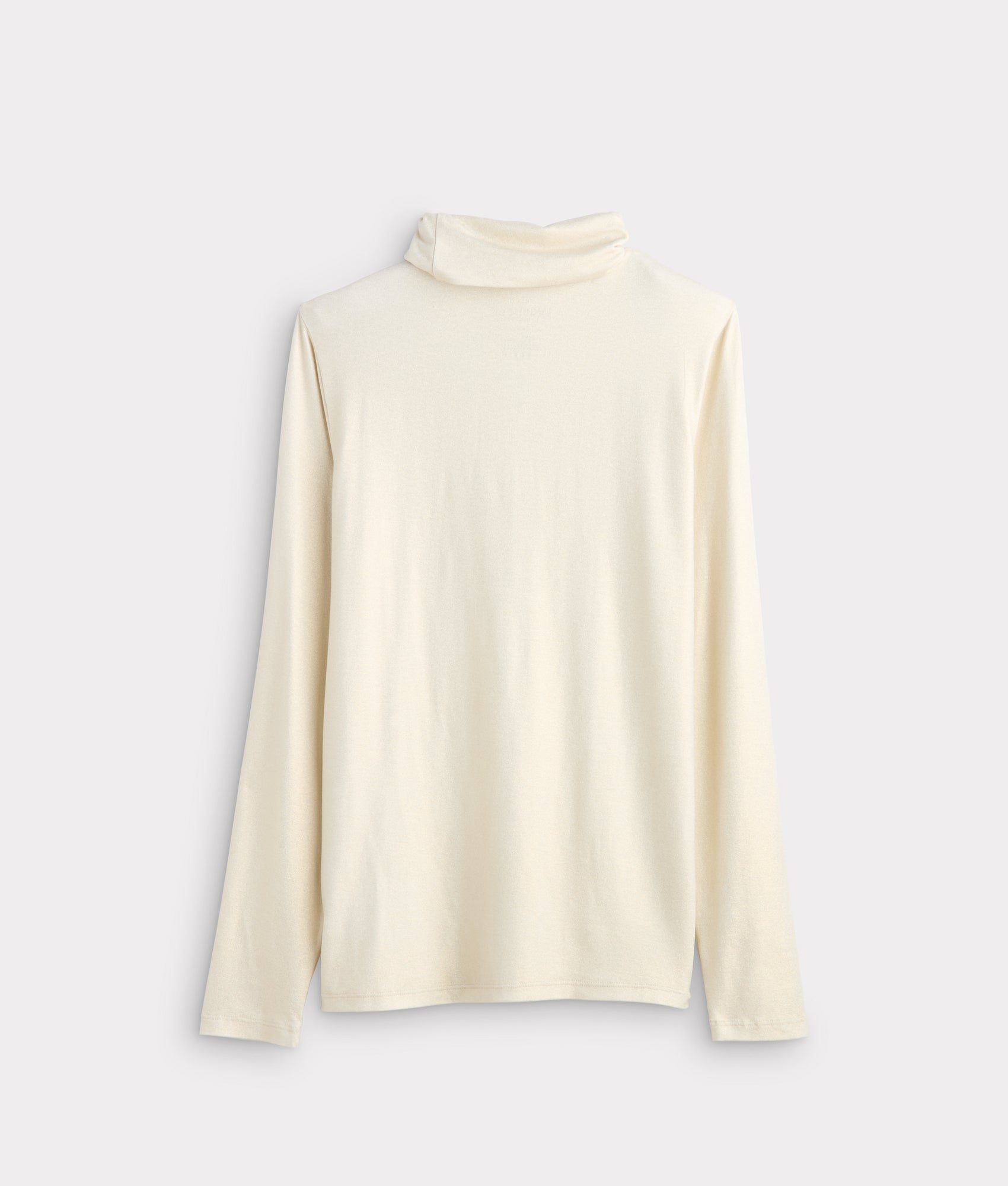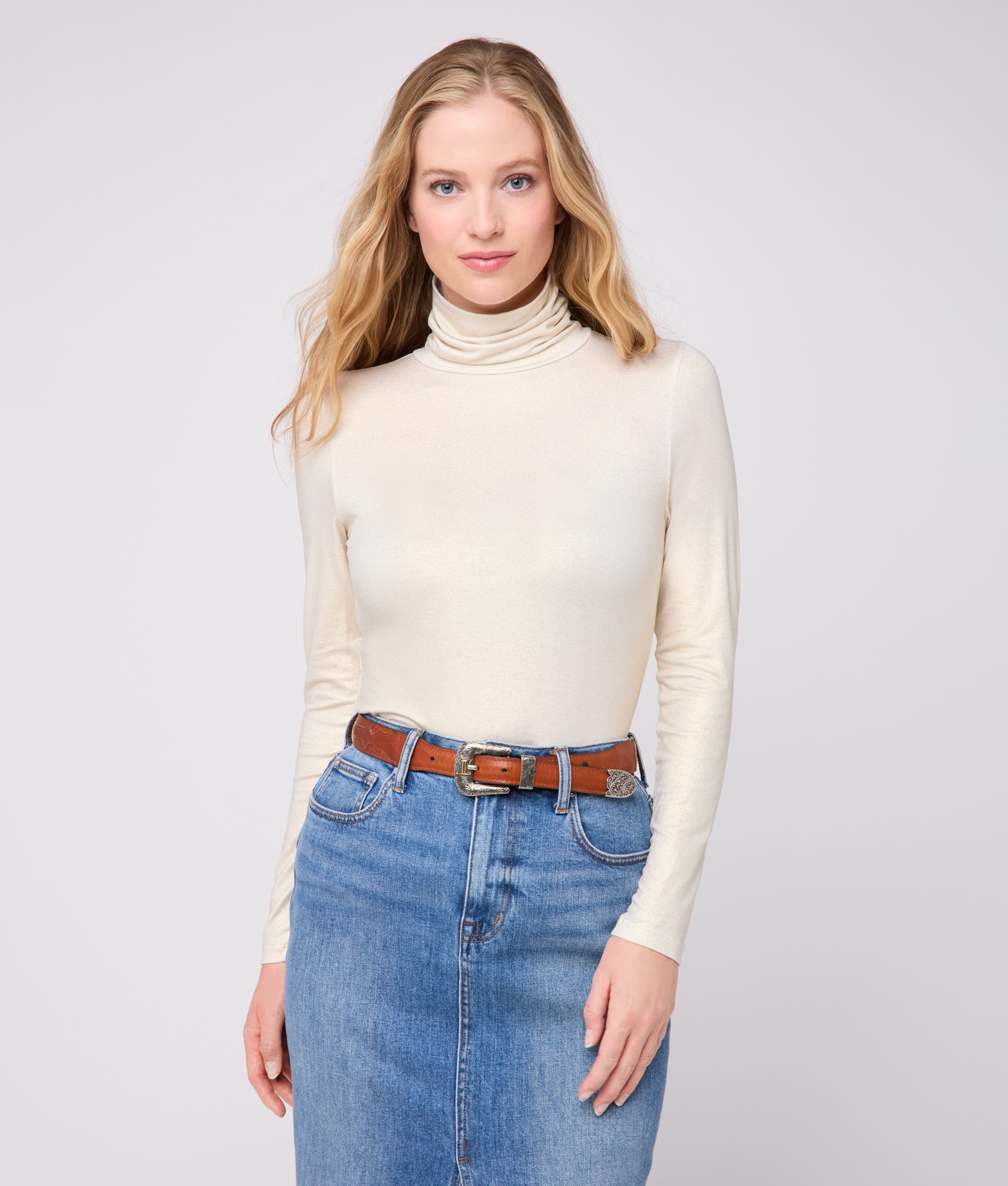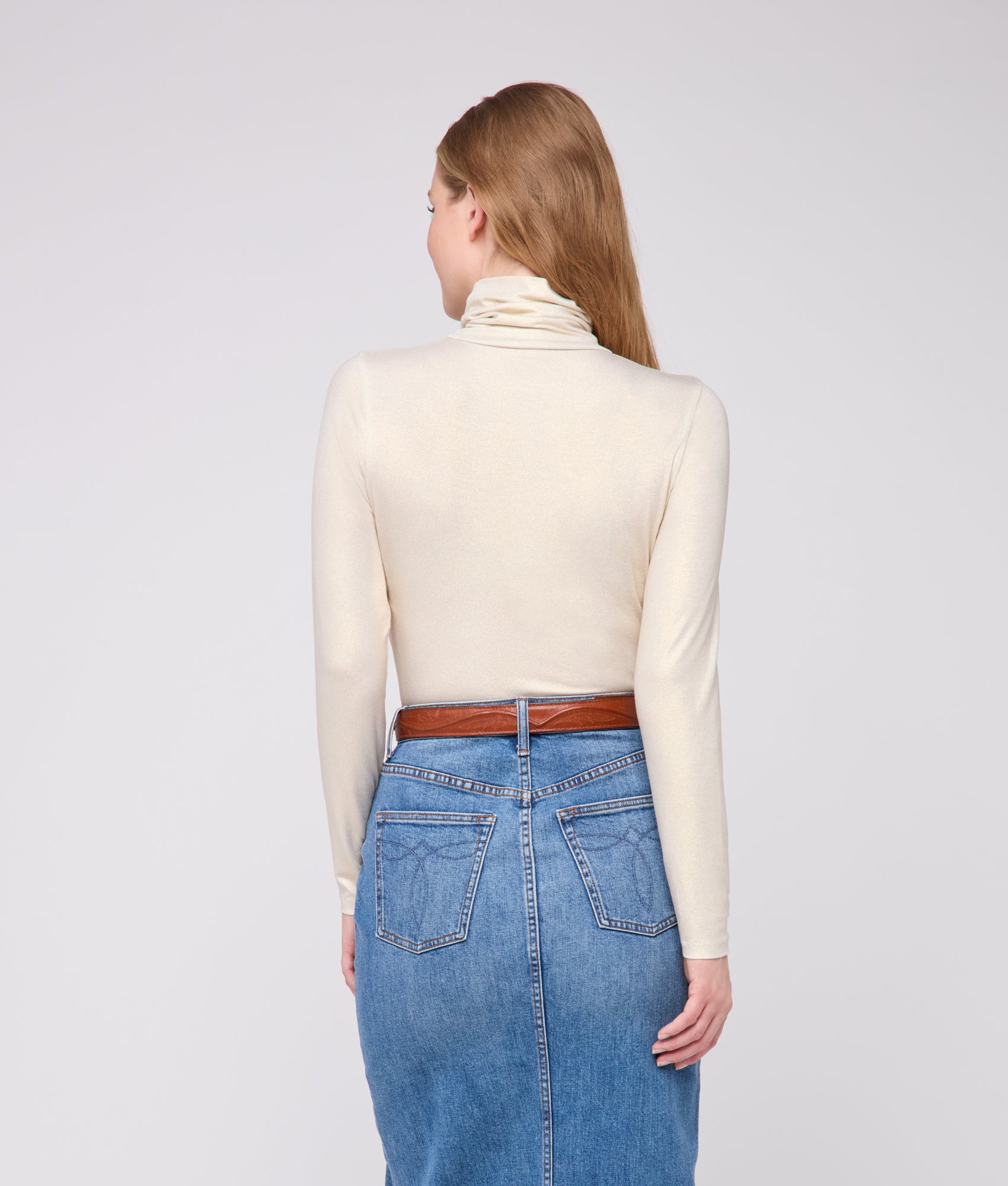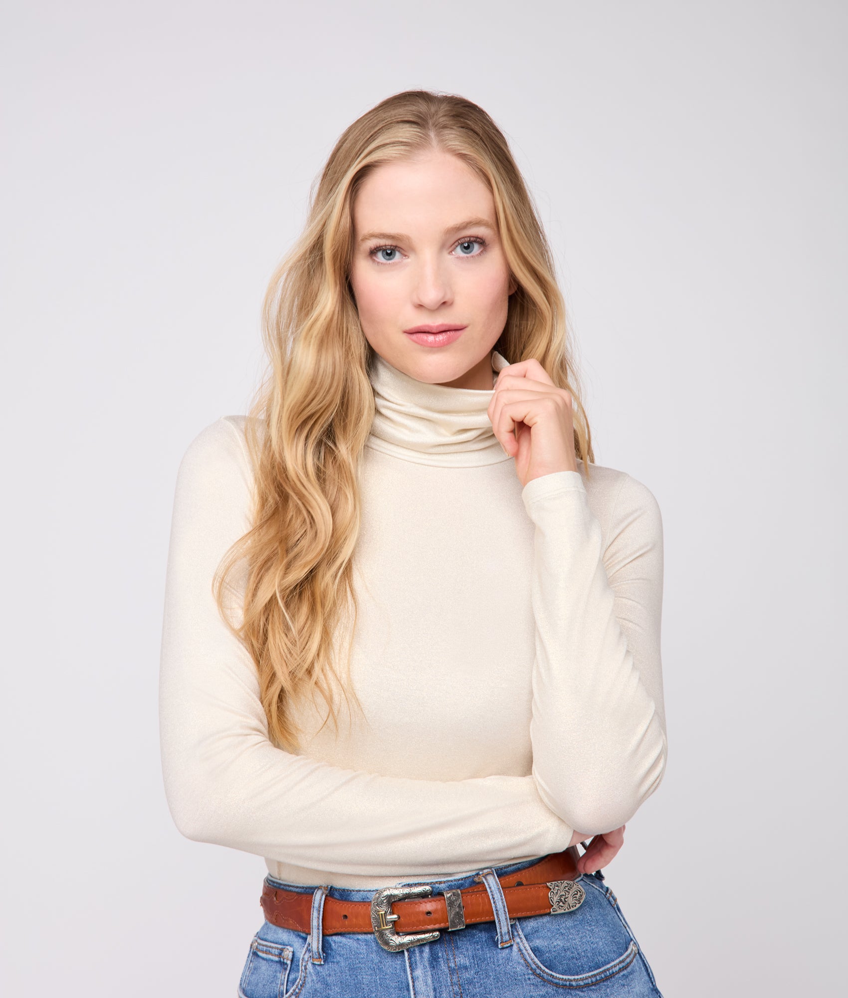 Crafted from a lustrous blend of viscose and elastane. the Aria Turtleneck captures light with a subtle. metallic sheen that elevates its sleek silhouette. Its sculptural form moves with fluid grace. marrying timeless elegance with a quiet nod to Western warmth. This piece transcends fashion—an artful expression of modern sophistication designed for both beauty and ease.