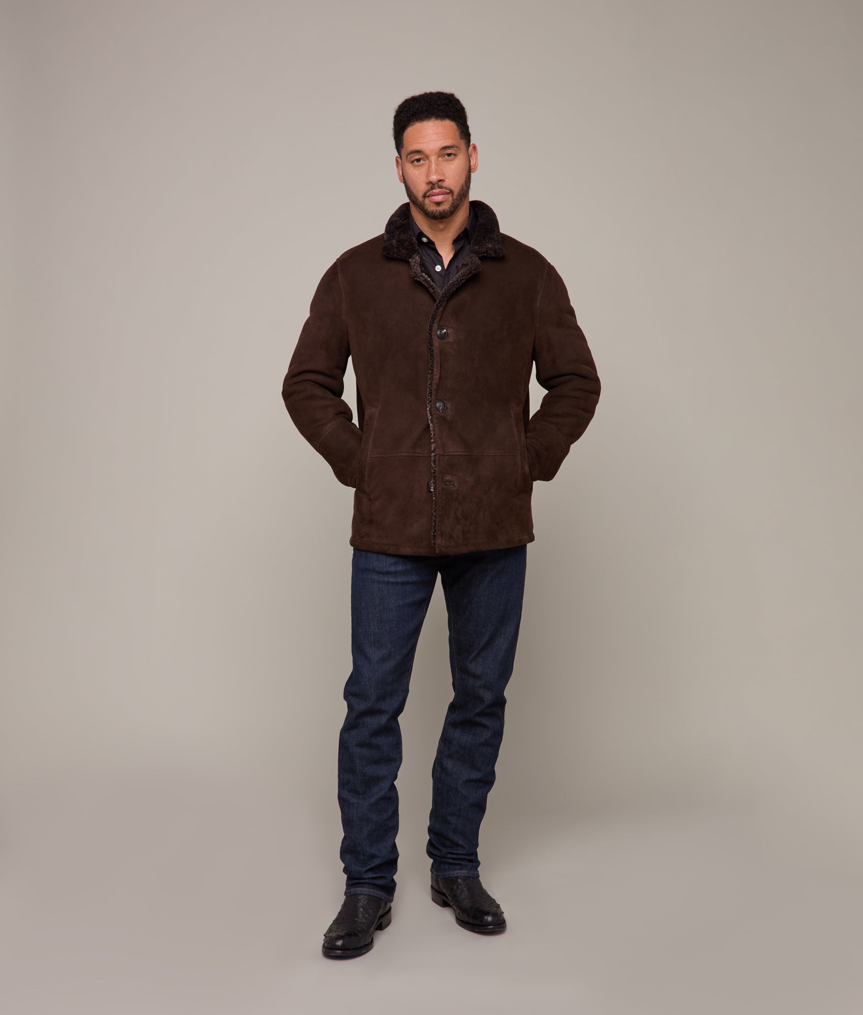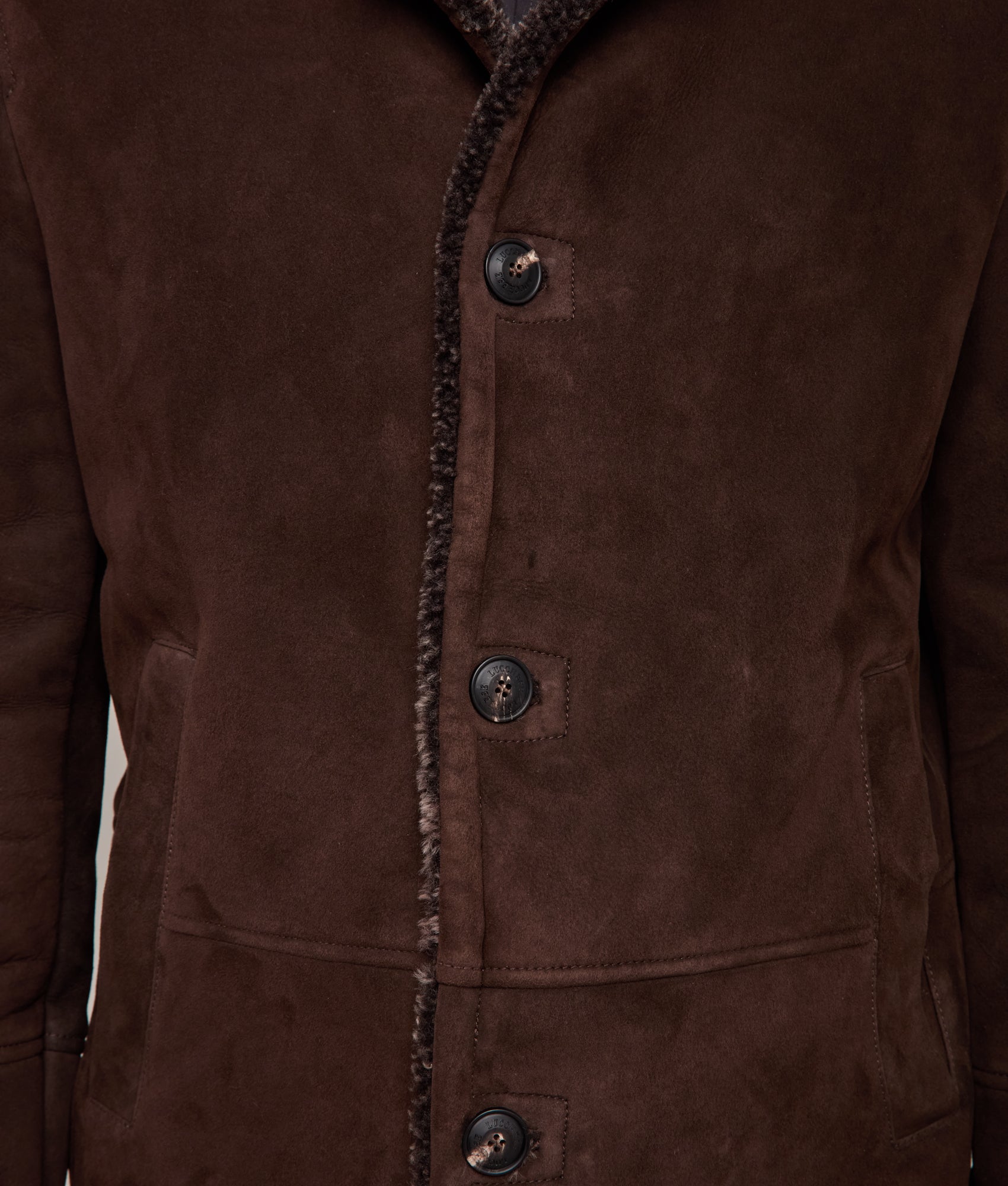 The Bruce Shearling Coat merges antiqued luxury with western sophistication. A suede exterior offers a silky smooth exterior aesthetic. while the interior is lined with shearling. The shearling offers superior warmth when stuck in the cold. while simultaneously offering a look of high-fashion.