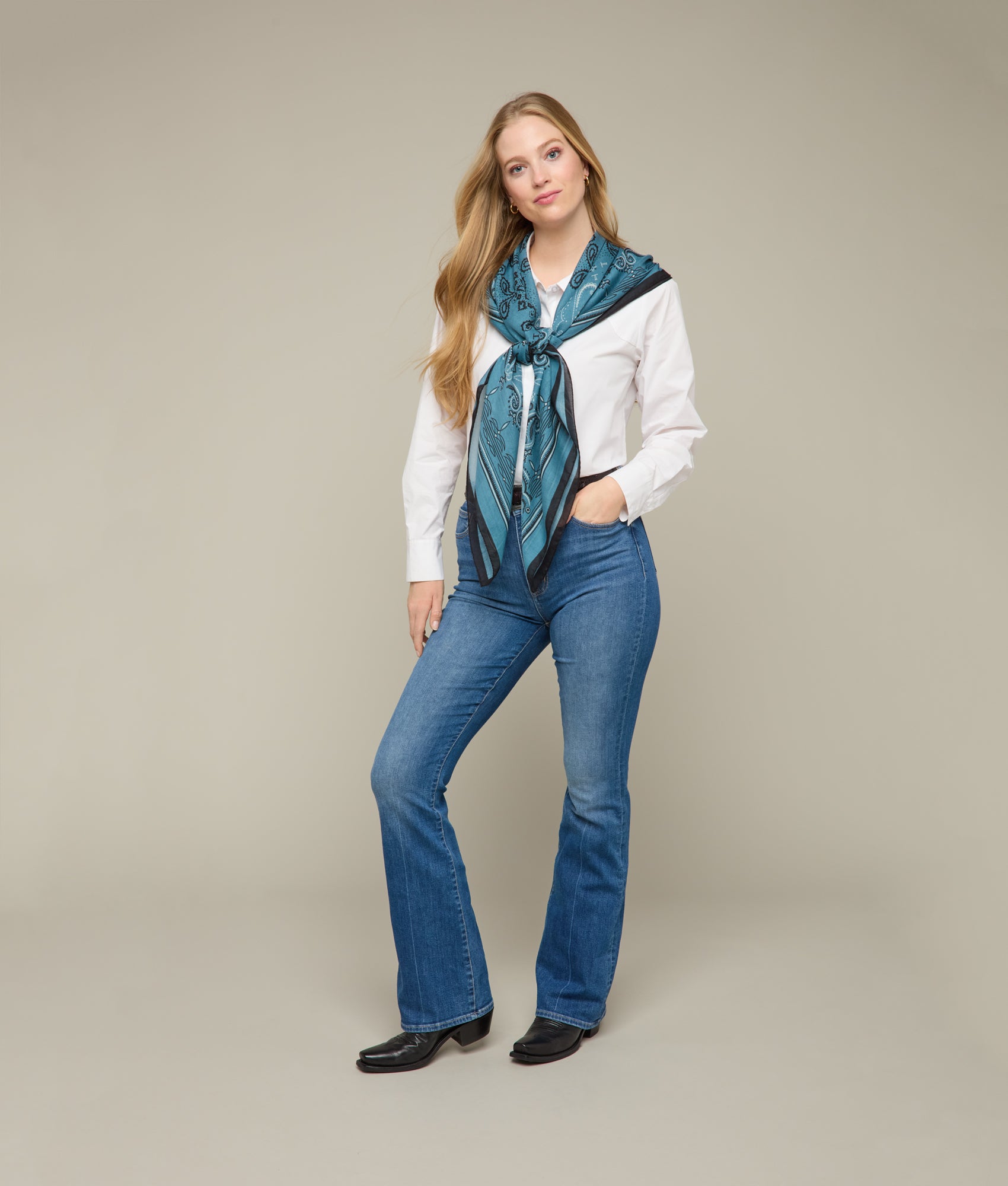 Based on our iconic Mirrored-L logo. this piece showcases subtle nods of Lucchese. Adorned with intricate. hand-drawn patterns inspired by classic western motifs. each design is a work of art. reflecting the spirit and heritage of the American West. The rich colors are carefully chosen to complement any outfit. adding a touch of opulence and style whether worn around the neck. as a headscarf. or tied to a handbag.