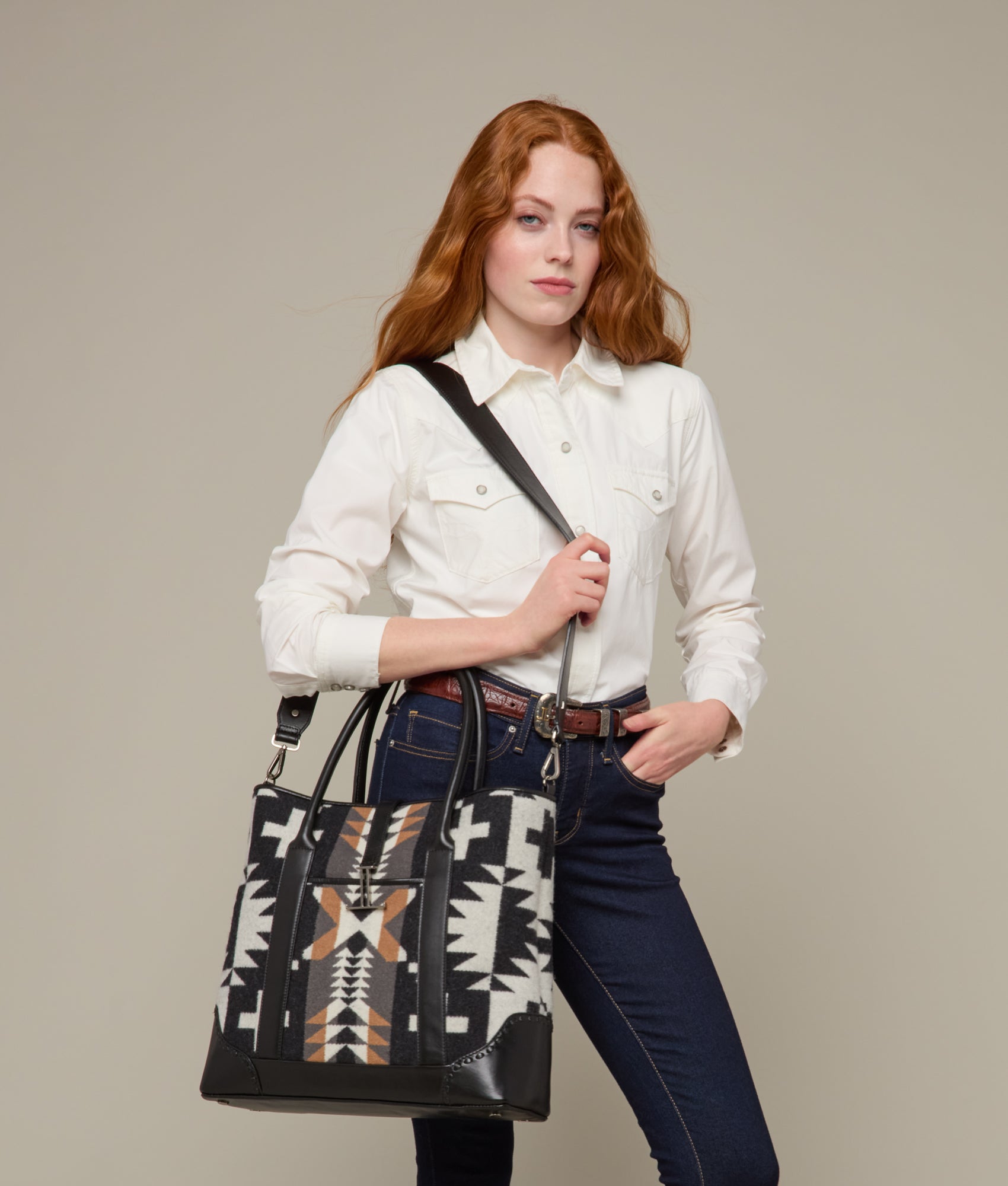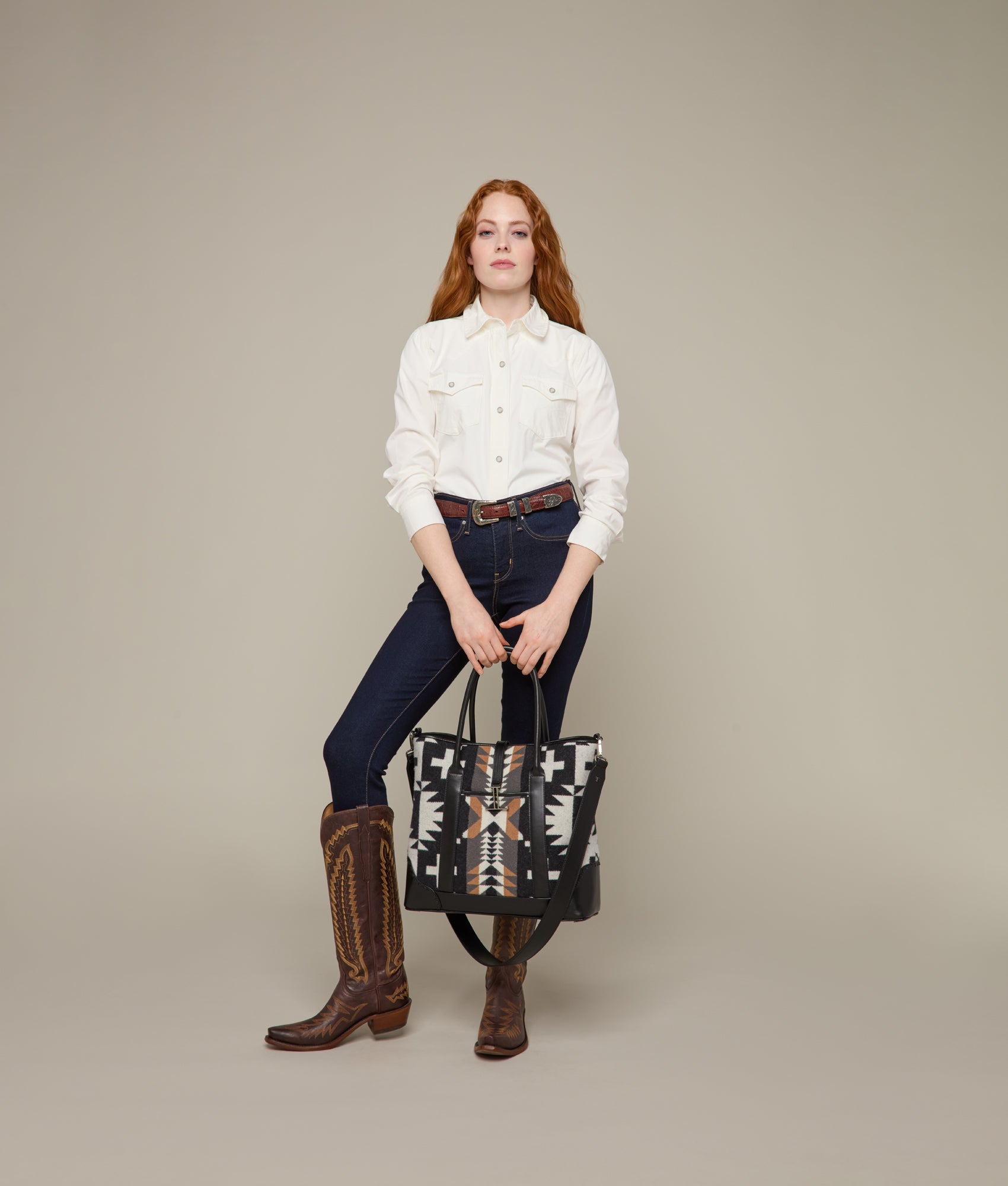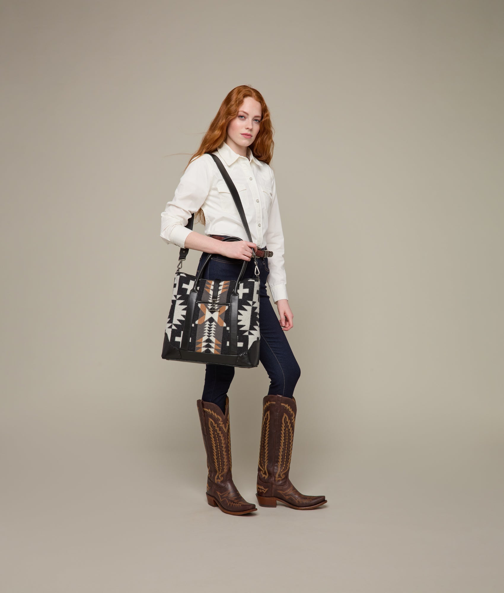 The Lucchese x Pendleton Caryall Tote draws its inspiration from Pendleton’s storied legacy and the intricate beauty of the Spider Rock pattern??a natural landmark etched into the fabric of culture. The rich. multi-colored Spider Rock pattern dances across the tote’s body. telling tales of rugged landscapes and timeless artistry. Every detail has been meticulously crafted. from the smooth Italian Nappa leather trim to the brushed nickel that pays homage to the American West. The magnetic side closure secures your essentials. while the detachable shoulder strap offers versatility. ensuring that this tote is as functional as it is beautiful. The Lucchese x Pendleton Caryall Tote is more than an accessory; it’s a statement. Wear it. carry it. and carry forward a legacy. Made in USA.