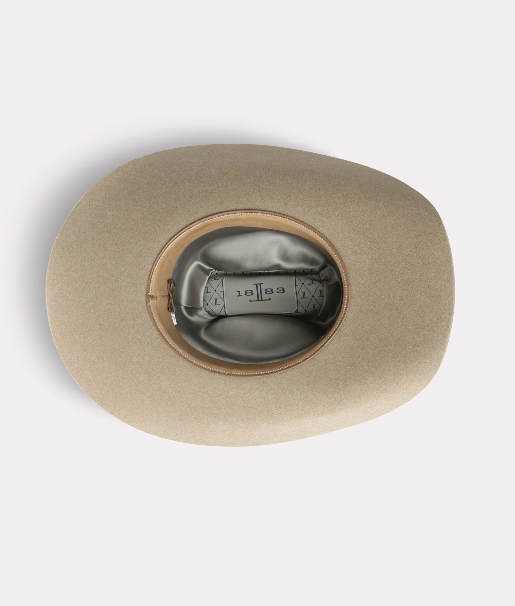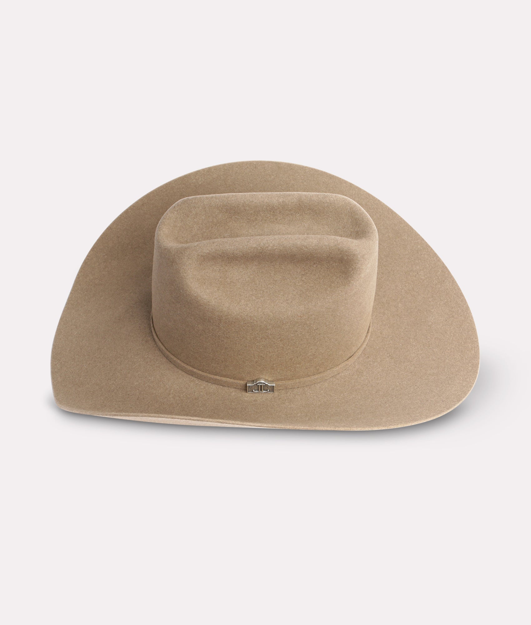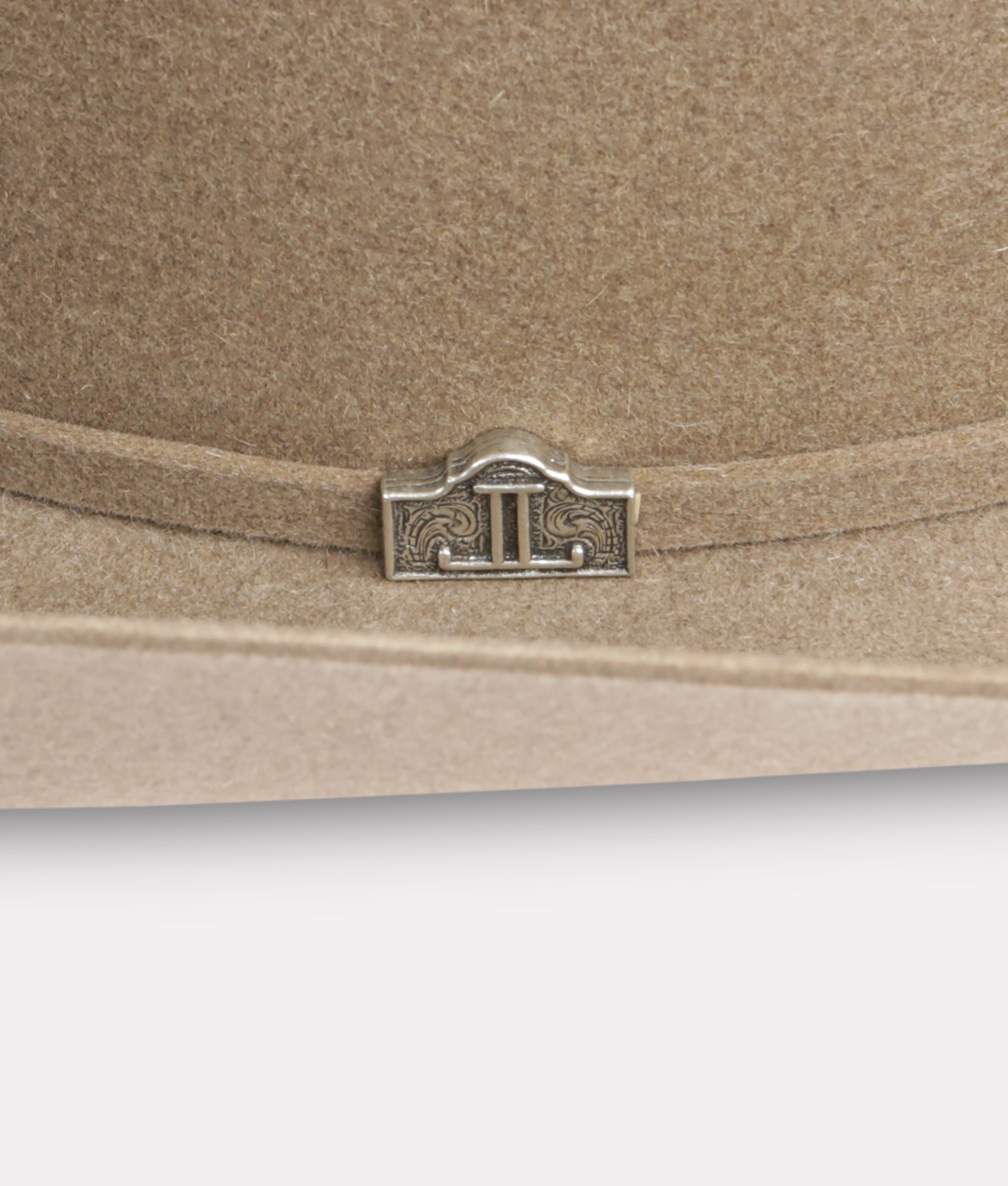 Part of our exclusive Lucchese Western hat collection. the Alamo is a hat that pays homage to the Lone Star State – inspired by the city where Lucchese Bootmaker was founded in 1883 and named after the historical landmark in Texas. The Alamo is 100% custom made and hand-shaped from a blend of the finest beaver nutria furs. A 5 ¾ tapered crown with a slightly modified cattleman’s crease and a 4 ½ brim achieve a Western look. A self-band made from its own body are attached with a handmade hat pin styled in the shape of the Alamo with the Lucchese mirrored-L 1883 logo inside the outline. Distressed to give an aged appearance. Handmade in Texas.