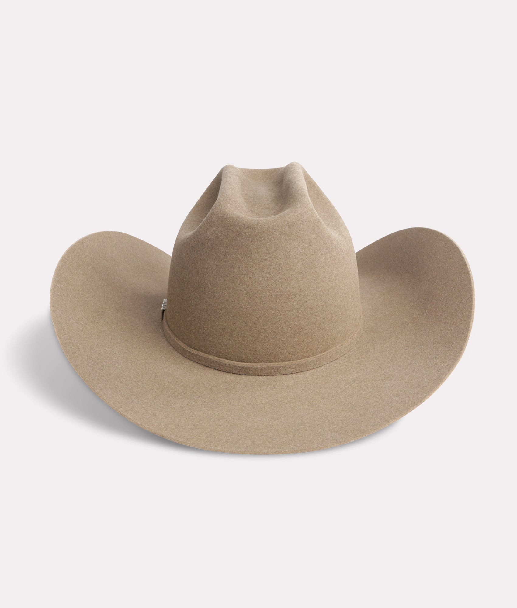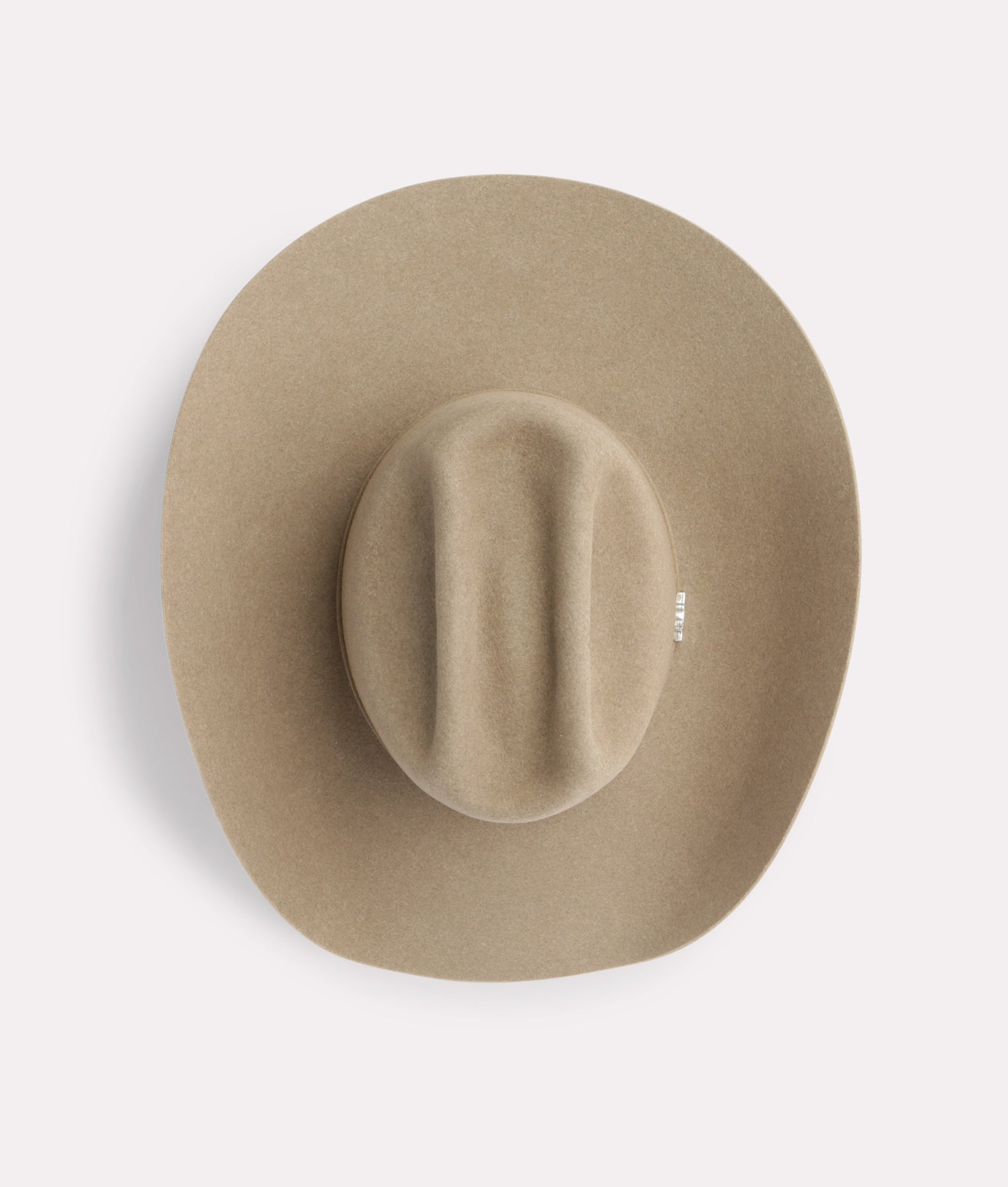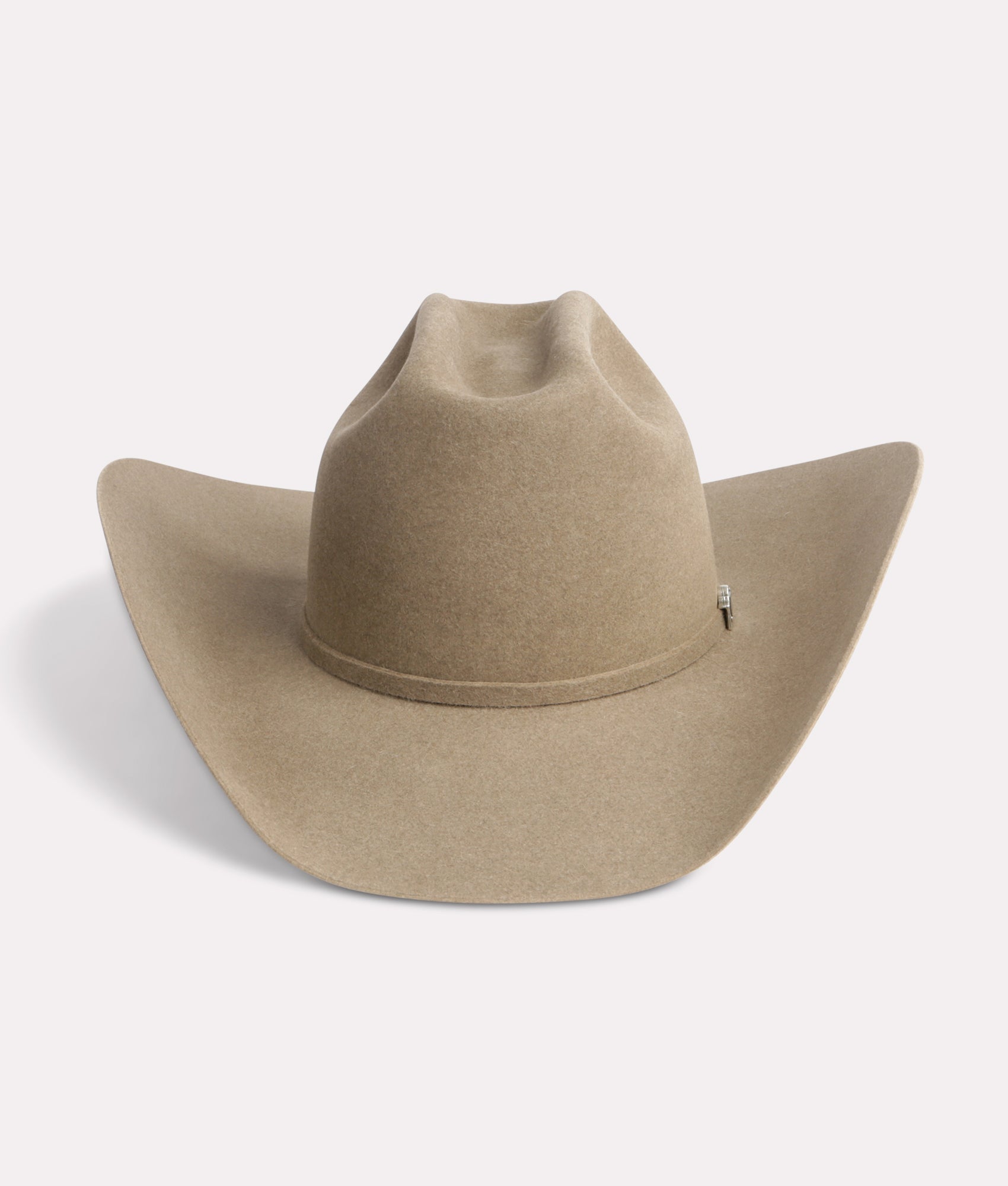 Part of our exclusive Lucchese Western hat collection. the Alamo is a hat that pays homage to the Lone Star State – inspired by the city where Lucchese Bootmaker was founded in 1883 and named after the historical landmark in Texas. The Alamo is 100% custom made and hand-shaped from a blend of the finest beaver nutria furs. A 5 ¾ tapered crown with a slightly modified cattleman’s crease and a 4 ½ brim achieve a Western look. A self-band made from its own body are attached with a handmade hat pin styled in the shape of the Alamo with the Lucchese mirrored-L 1883 logo inside the outline. Distressed to give an aged appearance. Handmade in Texas.