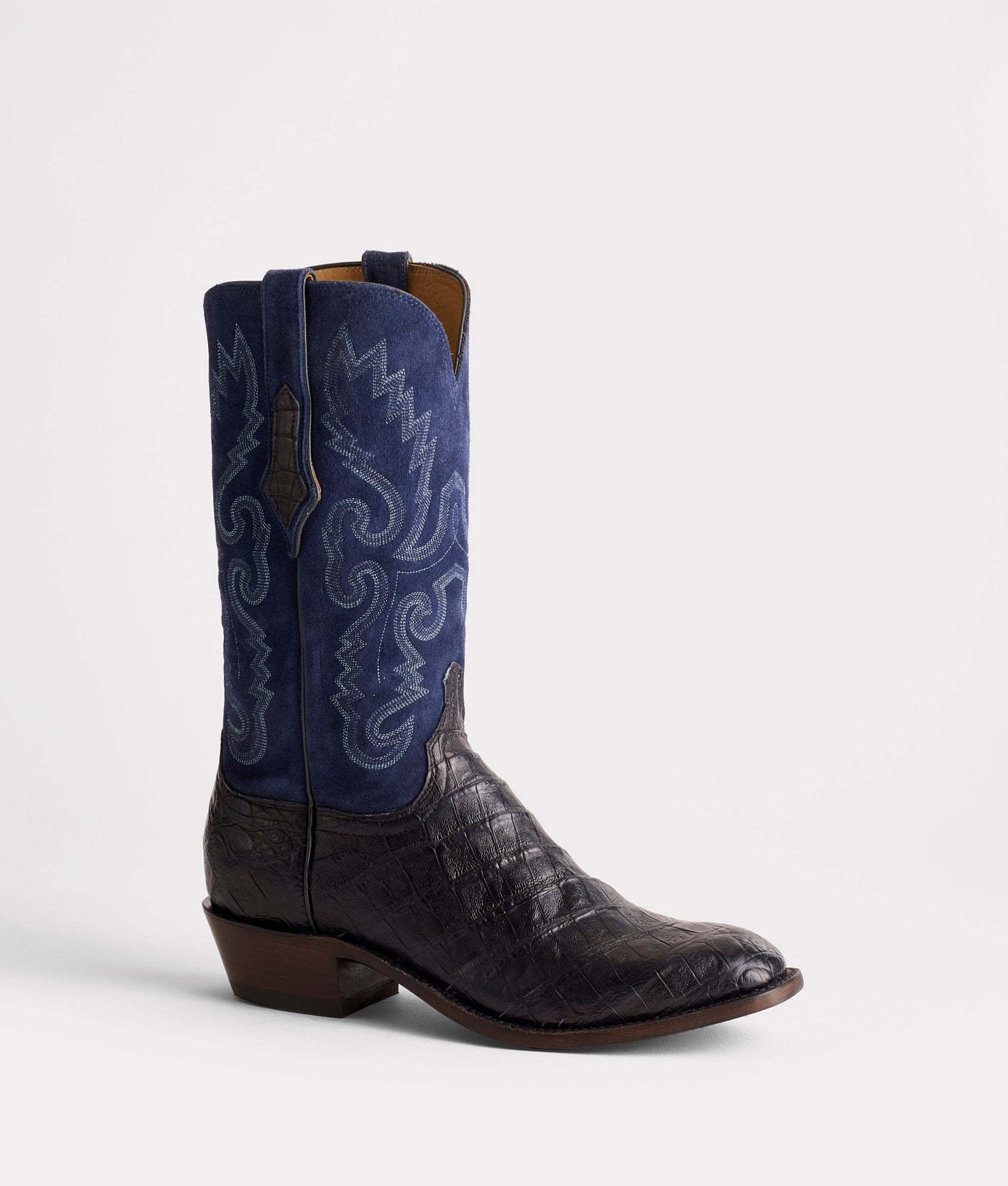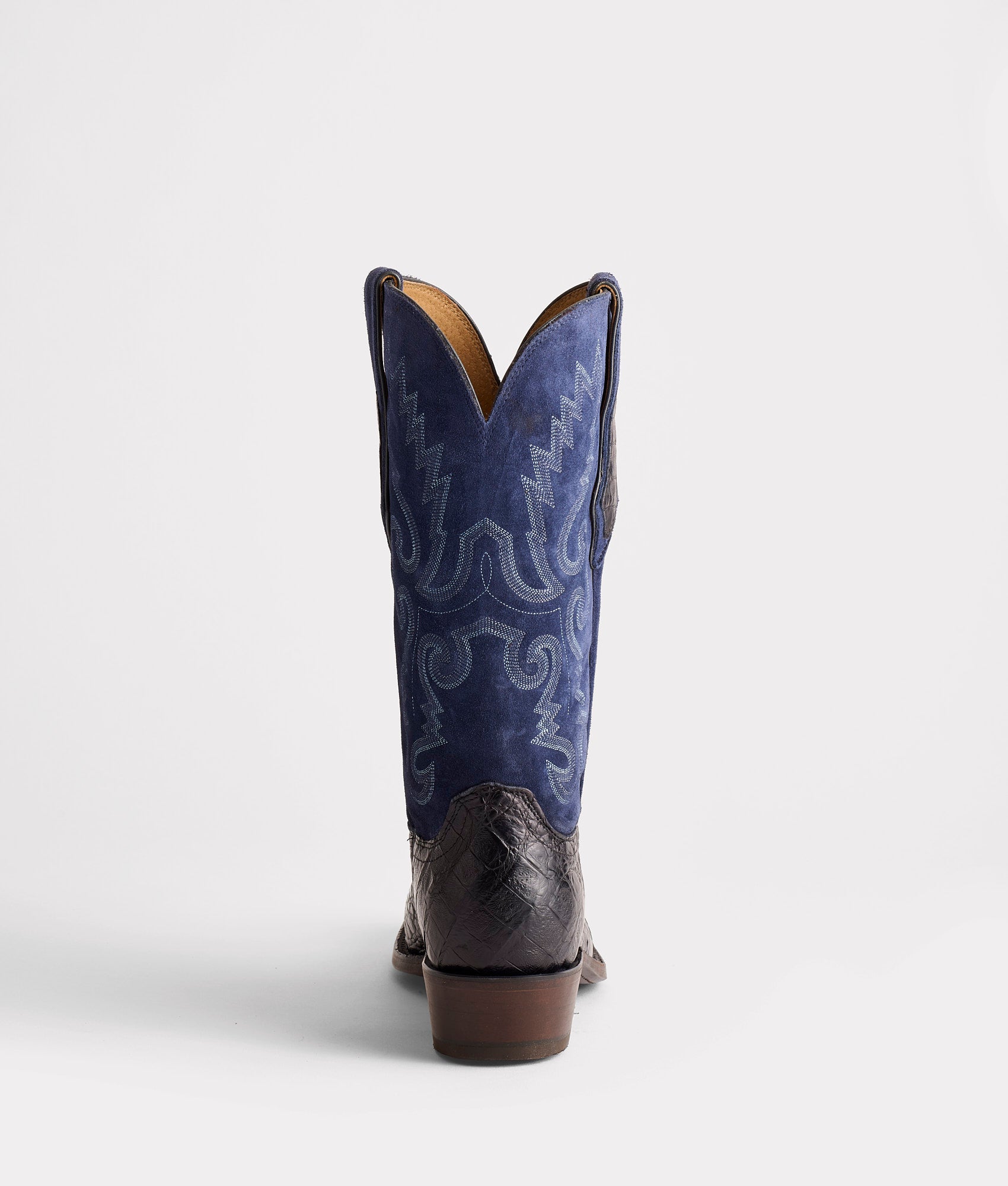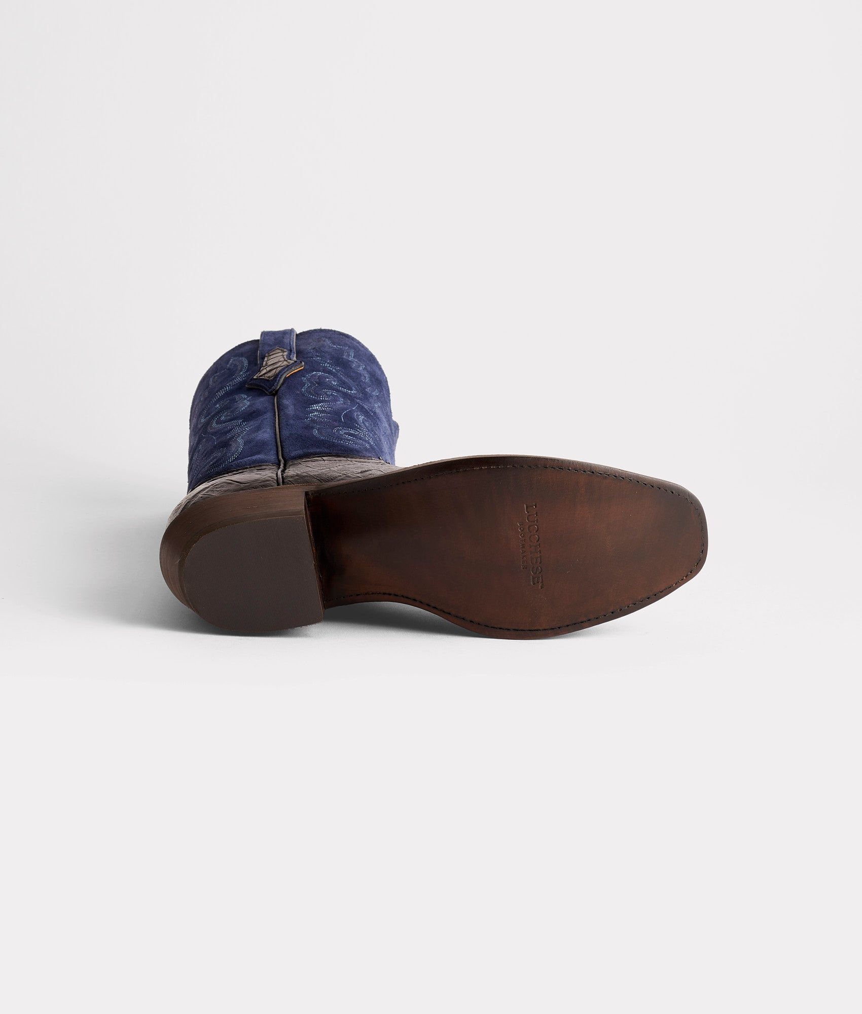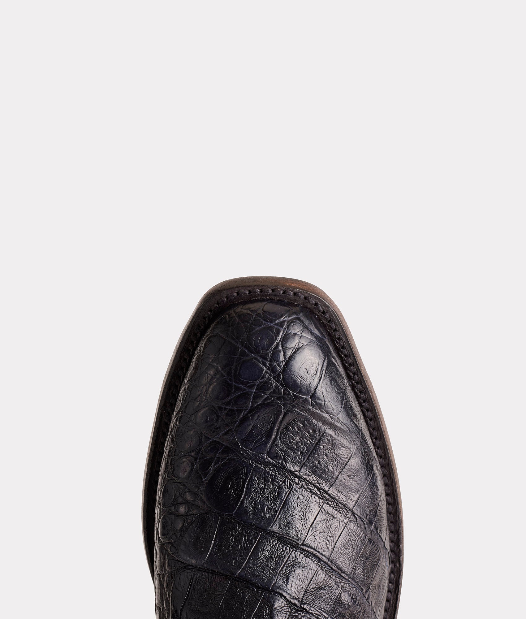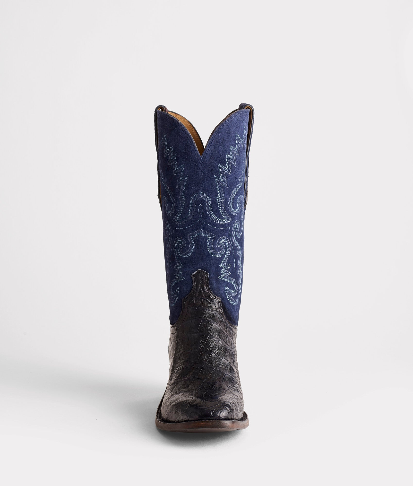 The Signal takes its name from a moment on the range??when a cowboy gives the signal. and the herd moves. the team rides. and the work begins. It’s a gesture of trust. instinct. and unspoken authority. Just like the cowboy’s cue. this boot speaks without saying a word??sharp. intentional. and ready to lead. Black Giant Caiman Belly meets deep blue Italian suede in a bold. unexpected pairing. While these two colors might traditionally clash. their contrasting textures tell us something different. The smooth. glossy finish of the Giant Caiman Belly plays perfectly against the soft. matte richness of the Italian Suede. Handmade in Texas.