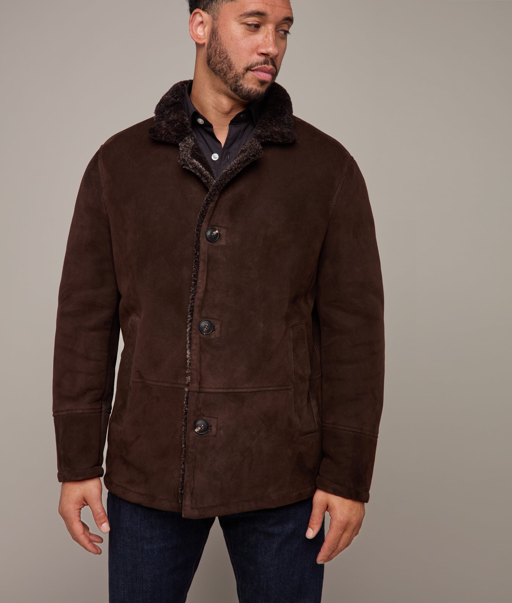 The Bruce Shearling Coat merges antiqued luxury with western sophistication. A suede exterior offers a silky smooth exterior aesthetic. while the interior is lined with shearling. The shearling offers superior warmth when stuck in the cold. while simultaneously offering a look of high-fashion.