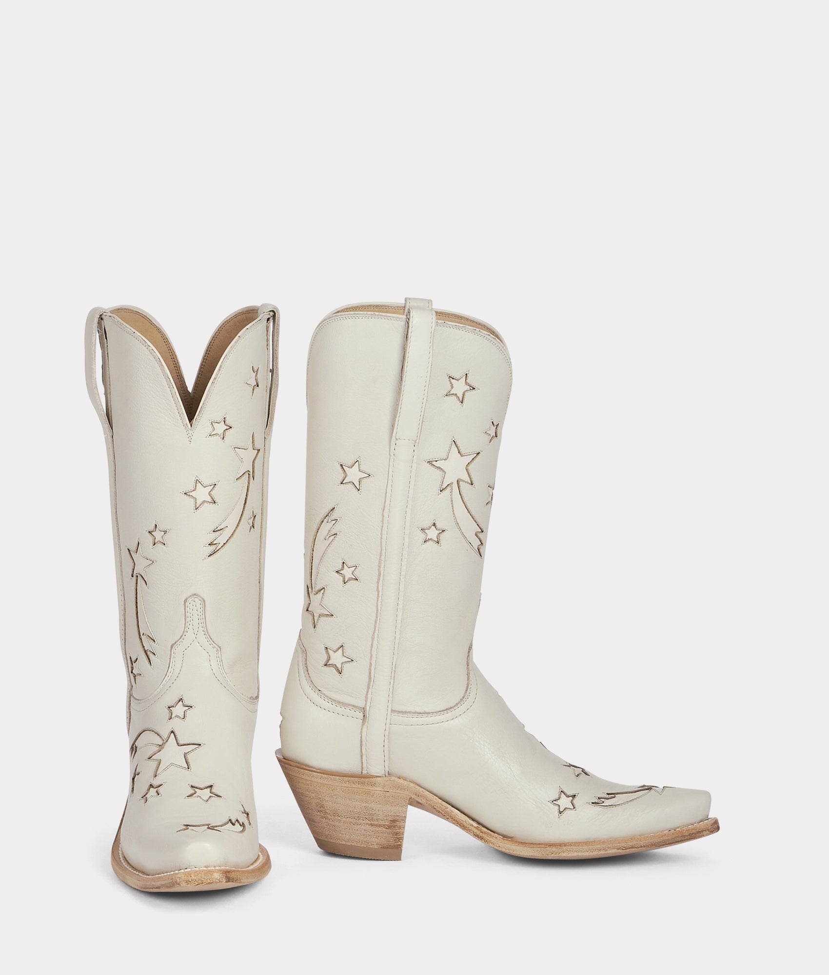 Rejuvenated designs. Reimagined styling. Comet is out of this world. Thoughtfully reworked. Comet fully encapsulates a starry South Texas night. Undeniably western yet refreshingly current. her quarters are fashioned from?glitz?cream?Goat leather accented with a Comet inlay. An 11 ?-inch Torero side seam and 2-inch fashion heel achieve a fun. luxurious aesthetic. With her unmistakable style and perfected craftsmanship. YOU are ready to embrace the real-world with an ‘out of this world’ boot. Dream big. cowgirl! Handmade in Texas.