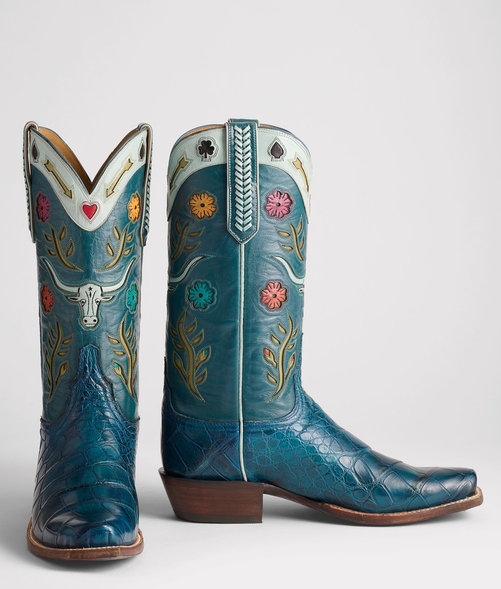 An heirloom. An ode. A statement told through craftsmanship. The Hat Tipper honors tradition with every cut and stitch. Its silhouette is a canvas for the time-tested artistry of our El Paso bootmakers. From collar to quarter. the Gallardo motifs tell the story of the West. saturated in rich color and layered with depth and texture. The 16-row. hand-laced Goat pull straps draw the eye down the crème side seam to the vamp. where every cut of Wild-Caught American Alligator reflects the respect our artisans show the process—hand-selected. hand-matched. and crafted with care. Respect begins with the work. not the words—Hat Tipper says more than the man will ever have to. Handmade in Texas.