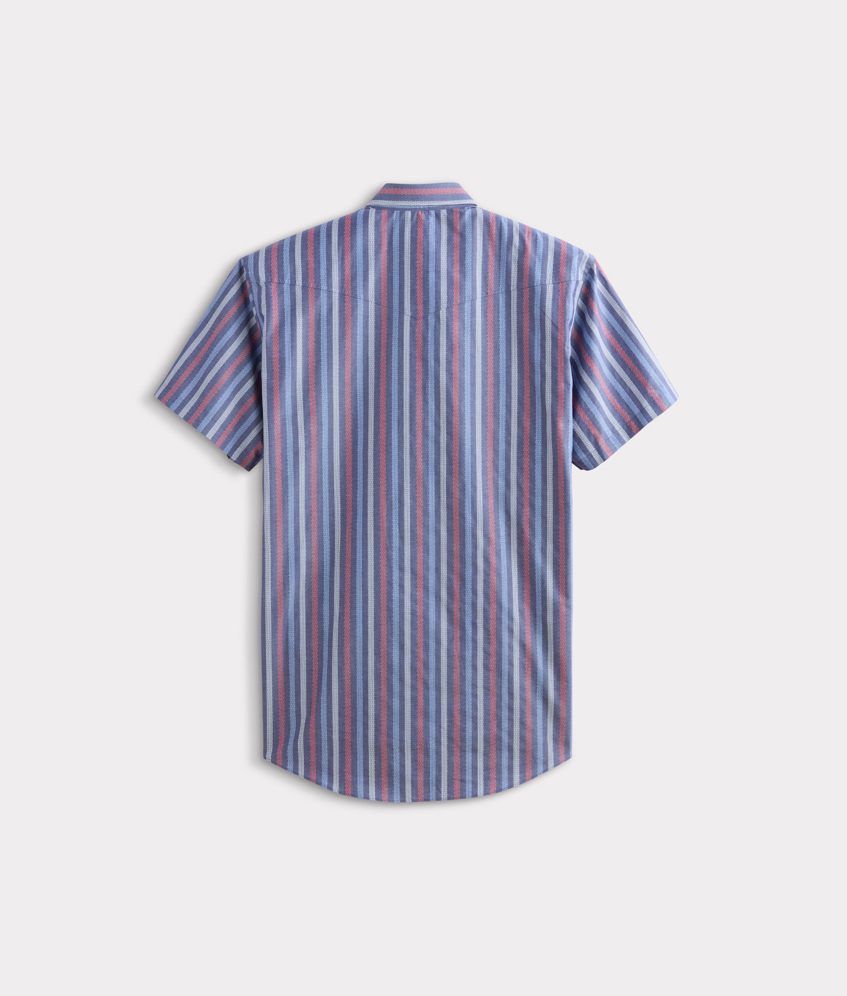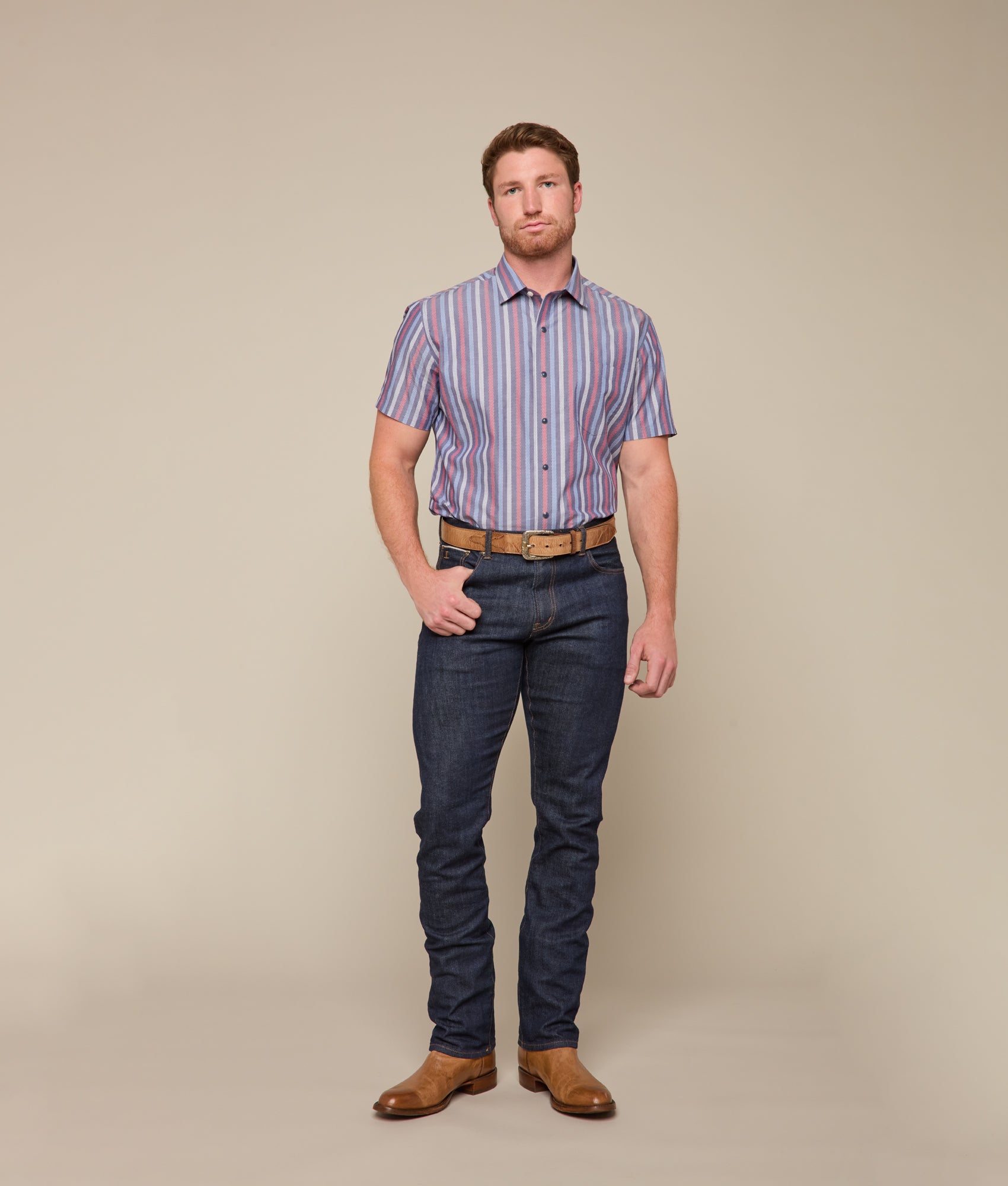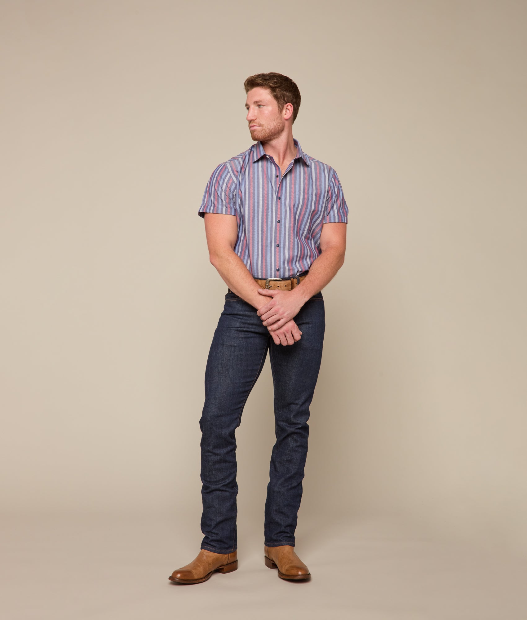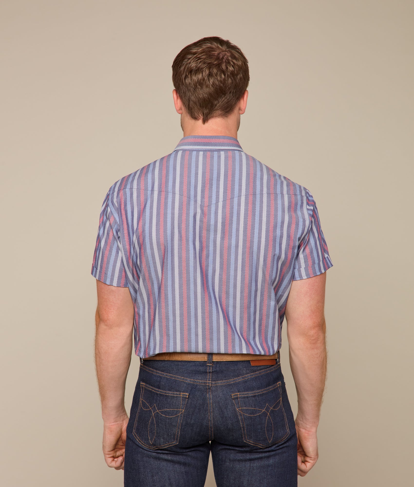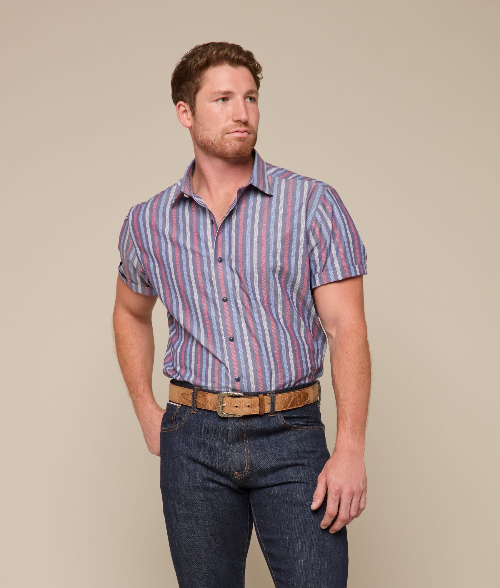 Part of the Parker McCollum collection. this short-sleeved snap shirt captures the heart of country cool. Known for his raw sound and honest lyrics. Parker brings that same authenticity to his signature style—laid-back. bold. and unmistakably Texan. This shirt features a standout stripe pattern in rich reds. deep blues. and soft greys that wrap all the way around for a clean. polished look. Parker gravitates toward this piece for its easy fit. classic western snaps. and colors echoing his music’s Texas roots. It’s the kind of shirt you can wear from the stage to the back porch—and everywhere in between.