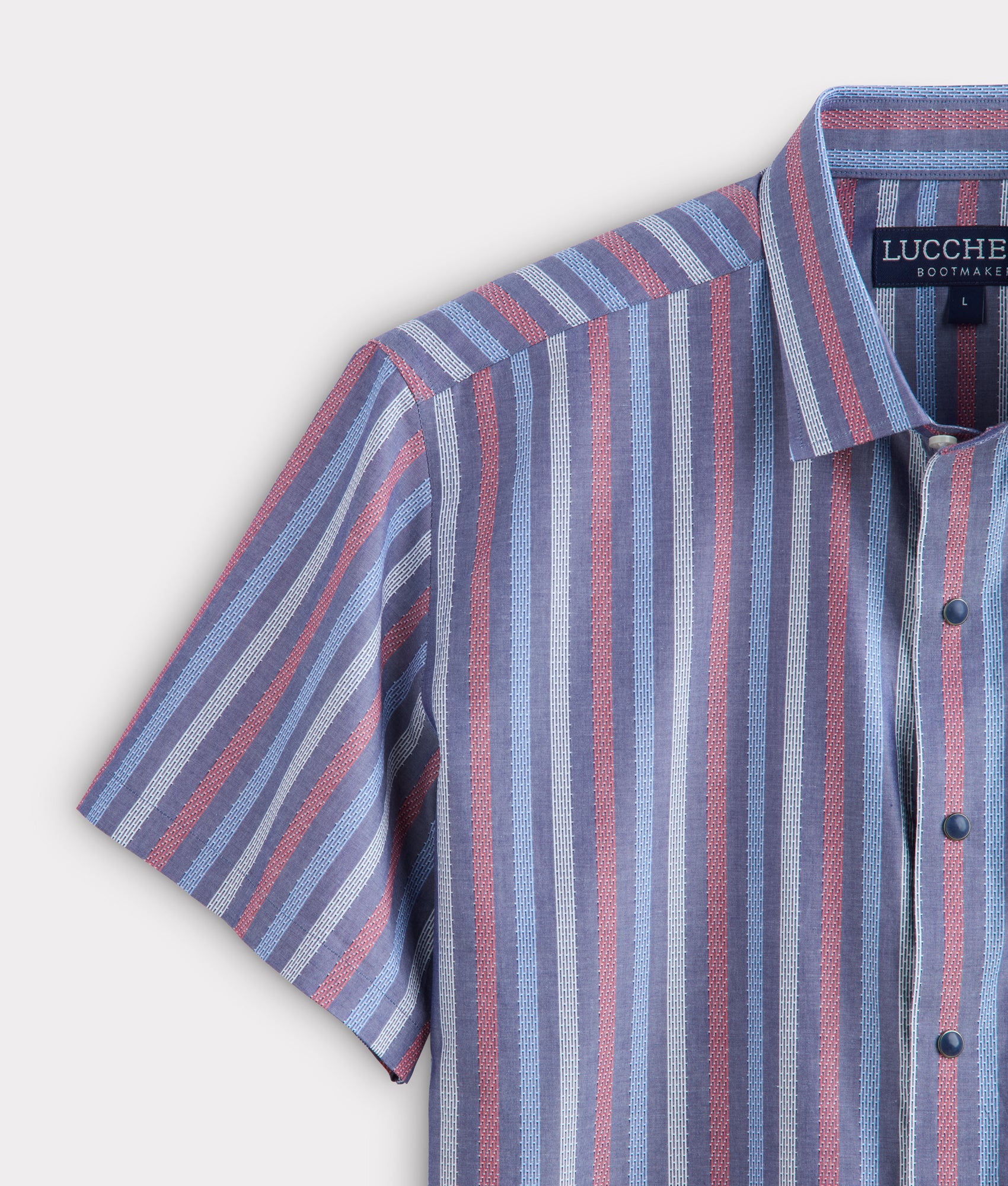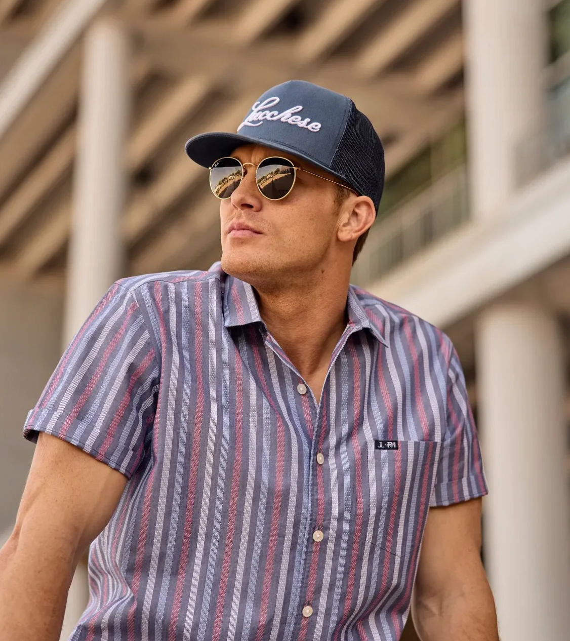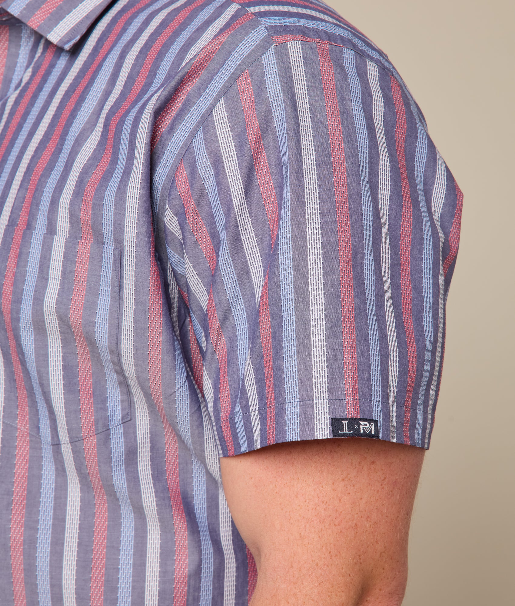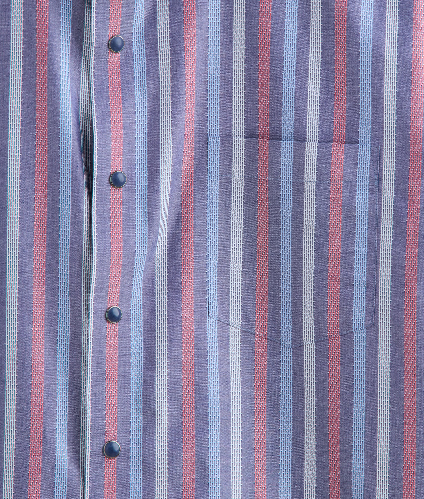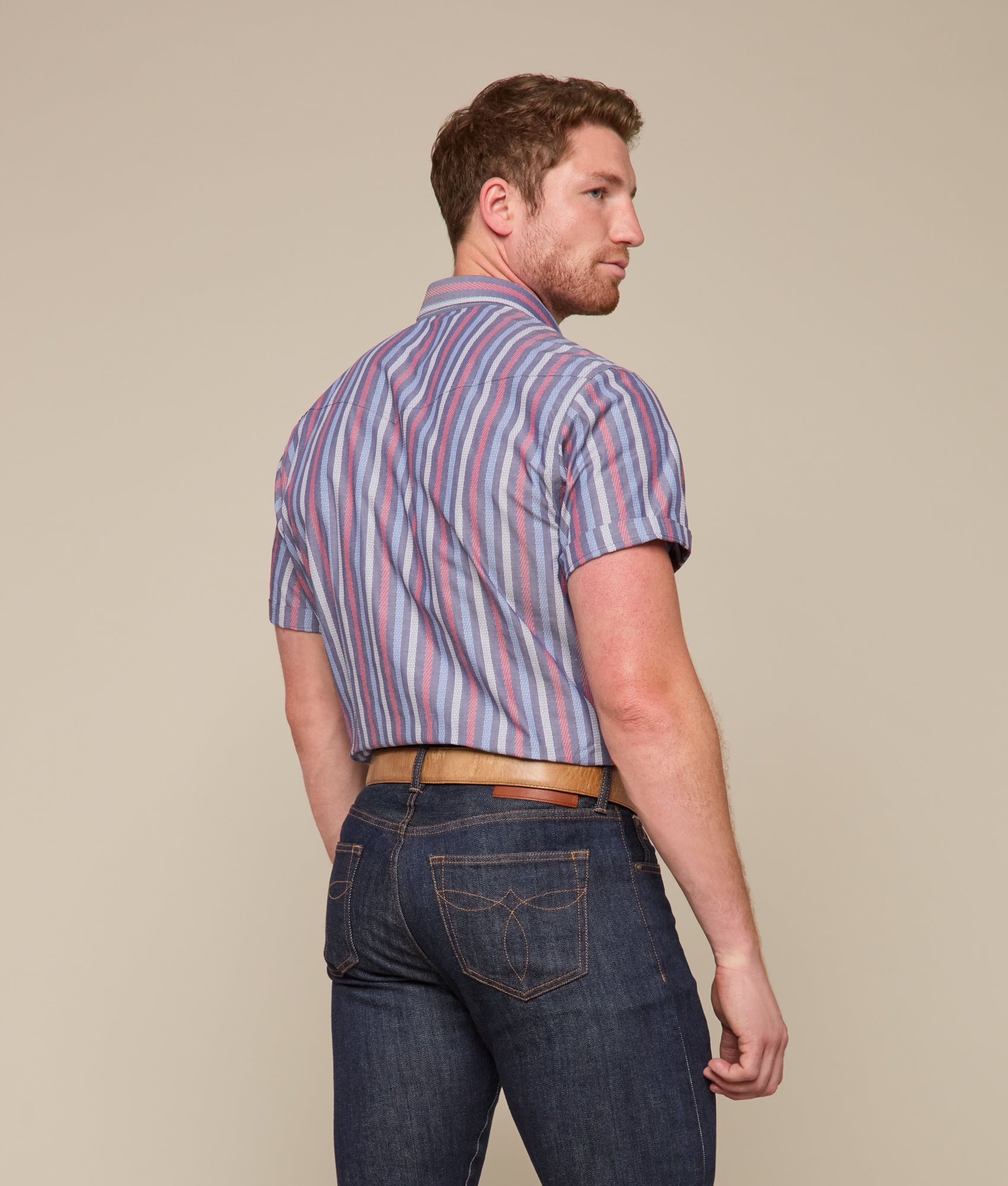 Part of the Parker McCollum collection. this short-sleeved snap shirt captures the heart of country cool. Known for his raw sound and honest lyrics. Parker brings that same authenticity to his signature style—laid-back. bold. and unmistakably Texan. This shirt features a standout stripe pattern in rich reds. deep blues. and soft greys that wrap all the way around for a clean. polished look. Parker gravitates toward this piece for its easy fit. classic western snaps. and colors echoing his music’s Texas roots. It’s the kind of shirt you can wear from the stage to the back porch—and everywhere in between.