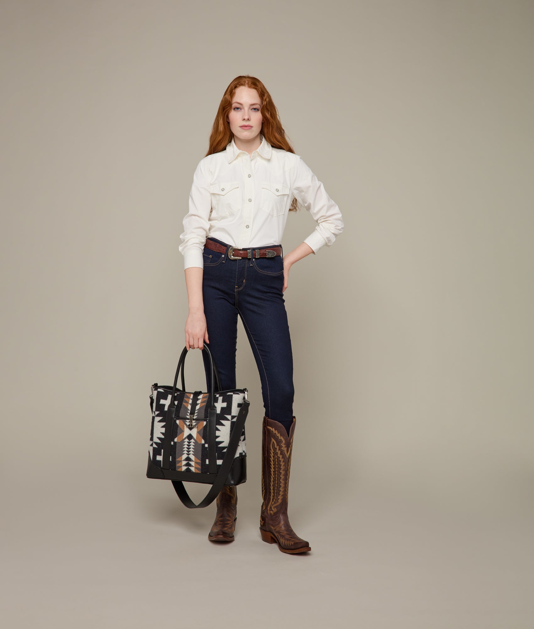 The Lucchese x Pendleton Caryall Tote draws its inspiration from Pendleton’s storied legacy and the intricate beauty of the Spider Rock pattern??a natural landmark etched into the fabric of culture. The rich. multi-colored Spider Rock pattern dances across the tote’s body. telling tales of rugged landscapes and timeless artistry. Every detail has been meticulously crafted. from the smooth Italian Nappa leather trim to the brushed nickel that pays homage to the American West. The magnetic side closure secures your essentials. while the detachable shoulder strap offers versatility. ensuring that this tote is as functional as it is beautiful. The Lucchese x Pendleton Caryall Tote is more than an accessory; it’s a statement. Wear it. carry it. and carry forward a legacy. Made in USA.