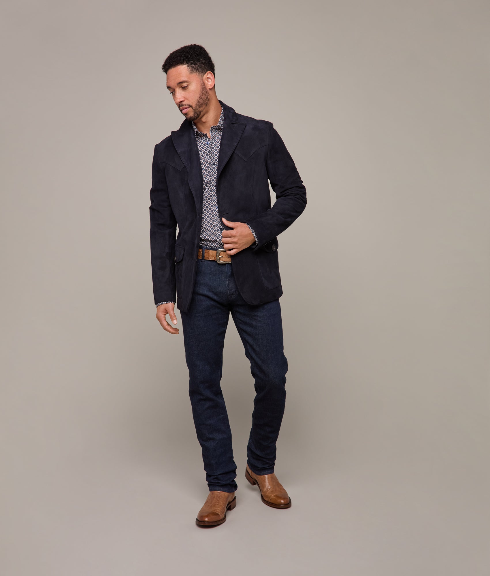 A statement piece rooted in tradition and built for the spotlight. the Rodeo Club Sport Coat marries Western heritage with the thought of winning a gold buckle. Crafted from 100% Lamb Suede. it offers a tactile richness that commands attention. The front and back Western yokes nod to classic Americana. while the vented lapel brings ease and movement—perfect for high-stakes moments and celebrations. Dual flap pockets provide structure with purpose. Made in Italy.