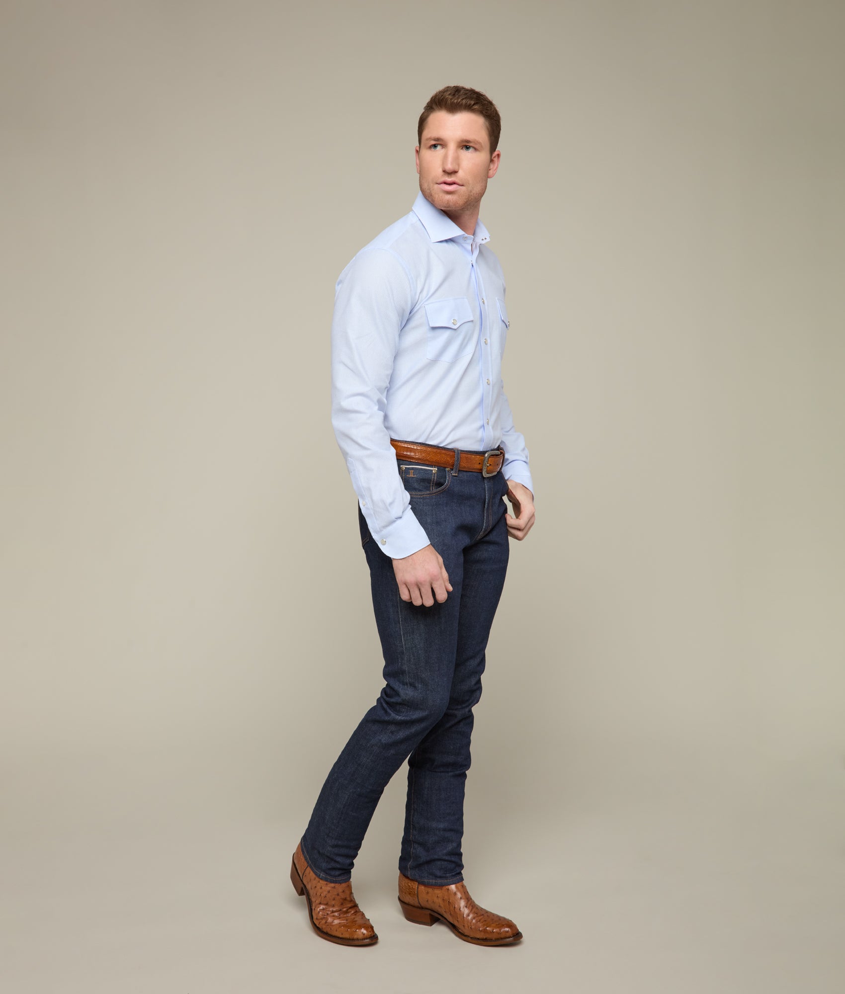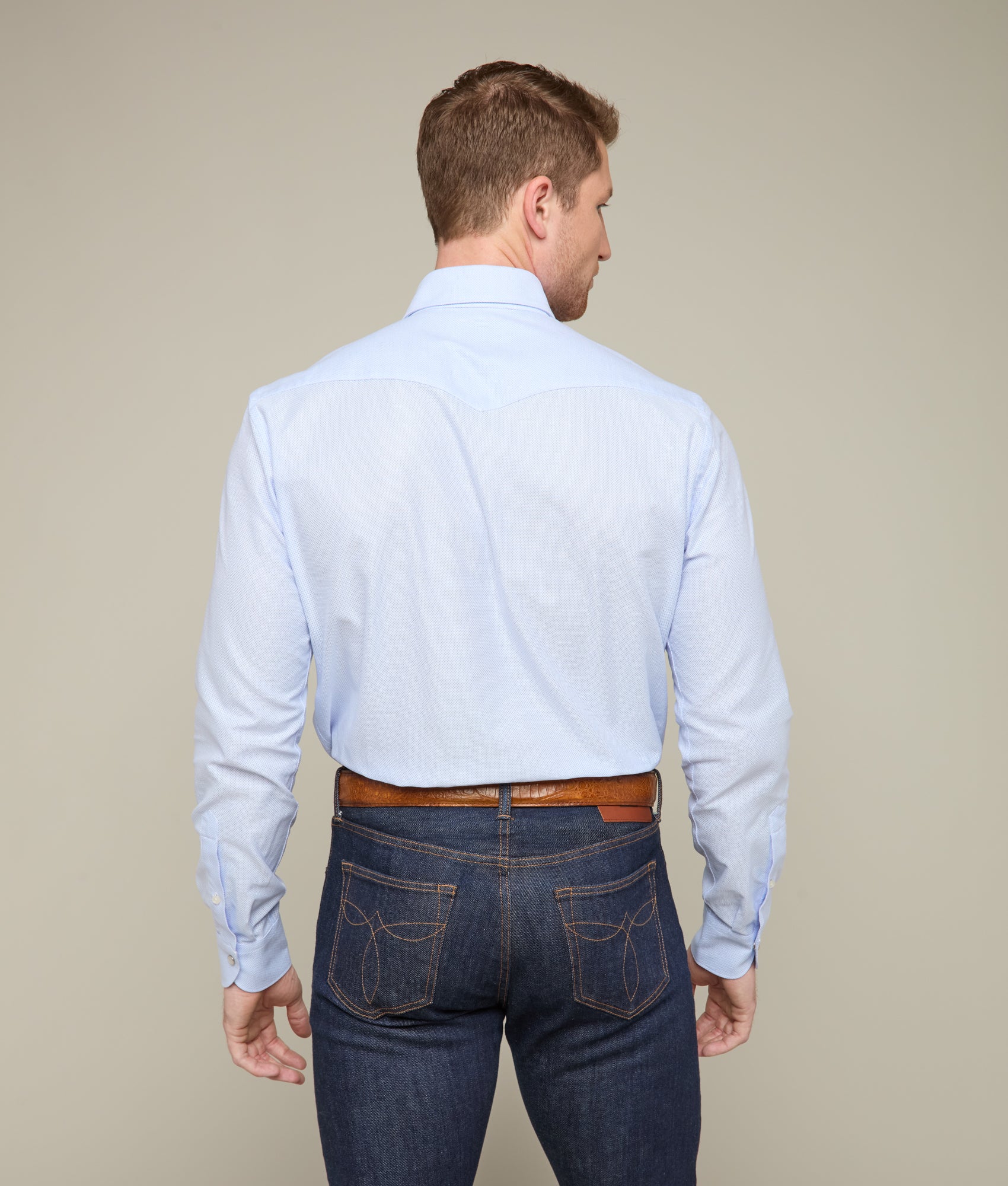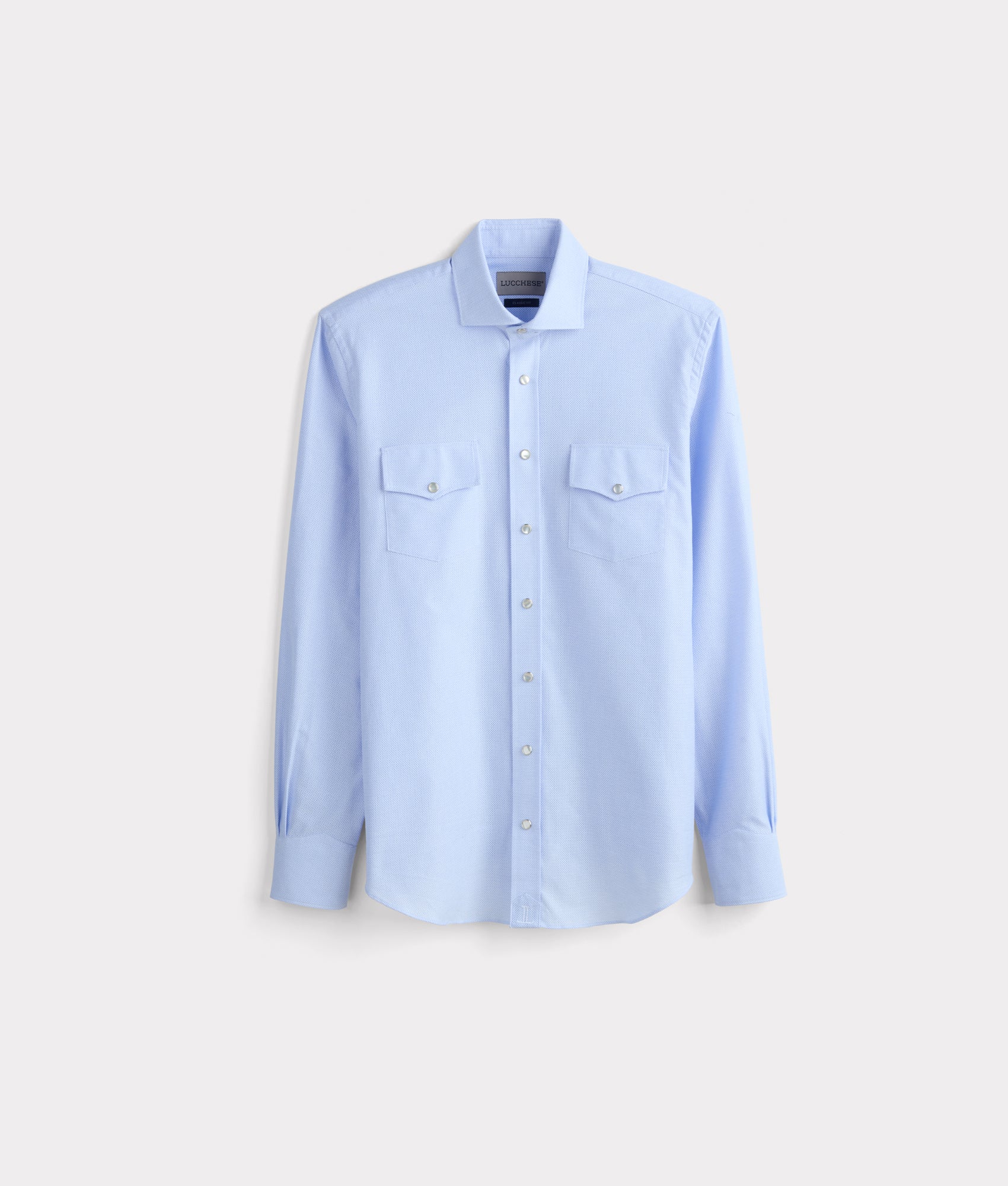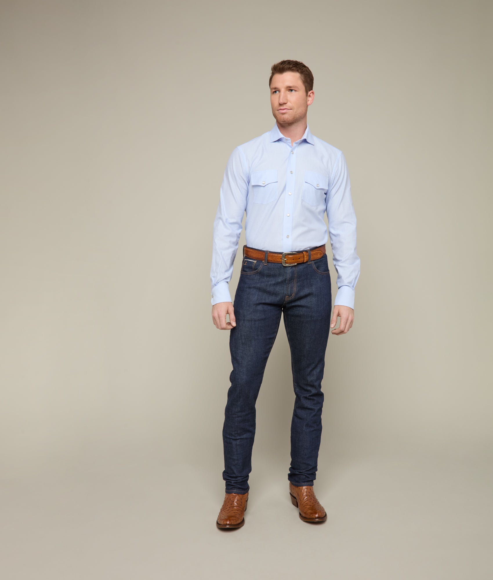 The Woodlands in blue is the perfect blend of rugged sophistication and refined style for the man who wears both a suit and boots with ease. Crafted from 100% premium cotton. this shirt offers comfort and breathability while maintaining a sharp. polished look. Featuring dual chest pockets with snap closures. it combines practicality with a sleek. tailored silhouette. The mirrored-L logo on the placket adds a subtle touch of elegance. making it a versatile piece that seamlessly transitions from a day at the office to a night out. Whether you’re dressing up or down. The Woodlands is the essential shirt for the modern man who values both style and functionality.