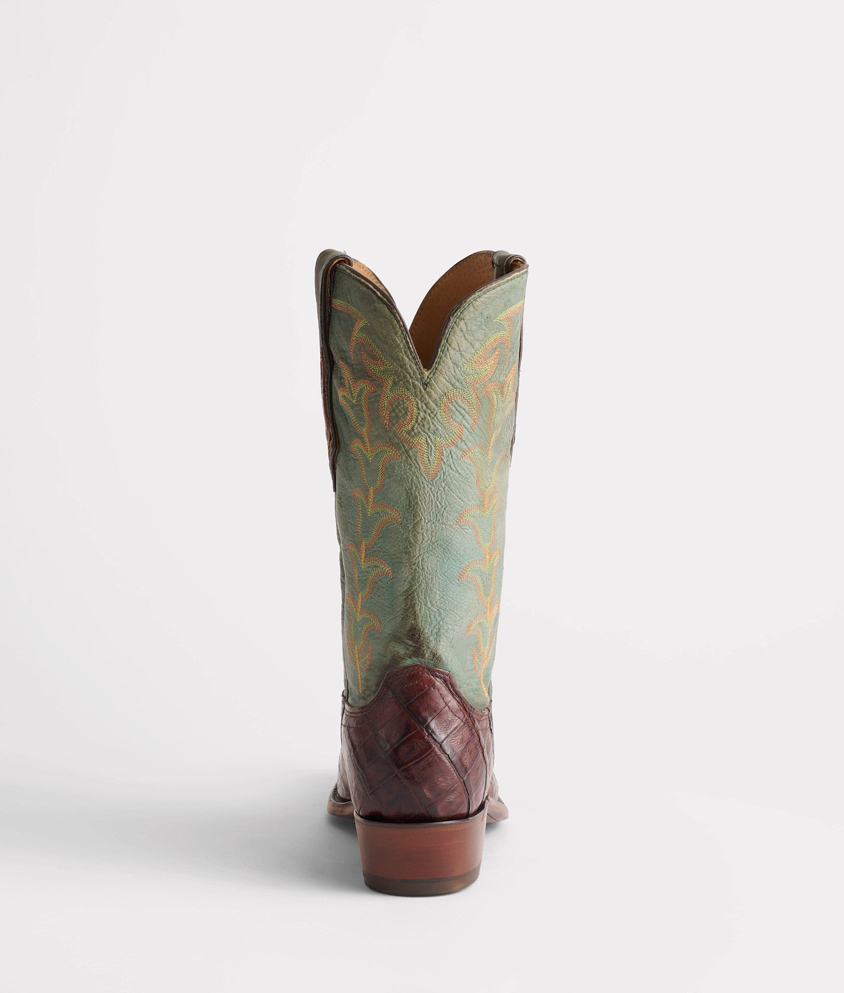 The man wearing?Tulipano?carries himself with quiet confidence. a presence that speaks before he ever says a word. He’s a man of contrasts ?C rugged yet refined. bold yet composed. Every detail of his style is intentional. and a reflection of his character. Hand-stained?Caiman in natural?brown?toneson?the?vamp?and?a?pop?of?color?on?the?Smooth?Ostrich quarters.?Why dirty a vase when you can freshen up a suit? Plus. leather smells better than tulips anyway! Handmade in Texas.